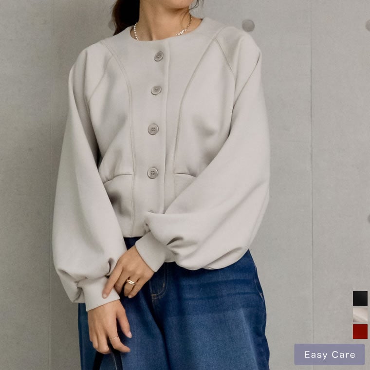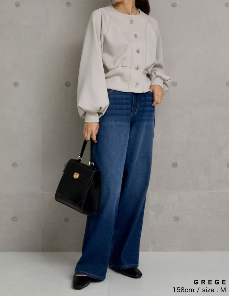 全体的に丸みのあるシルエットかつ、ショート丈でバランス良く着こなせます。