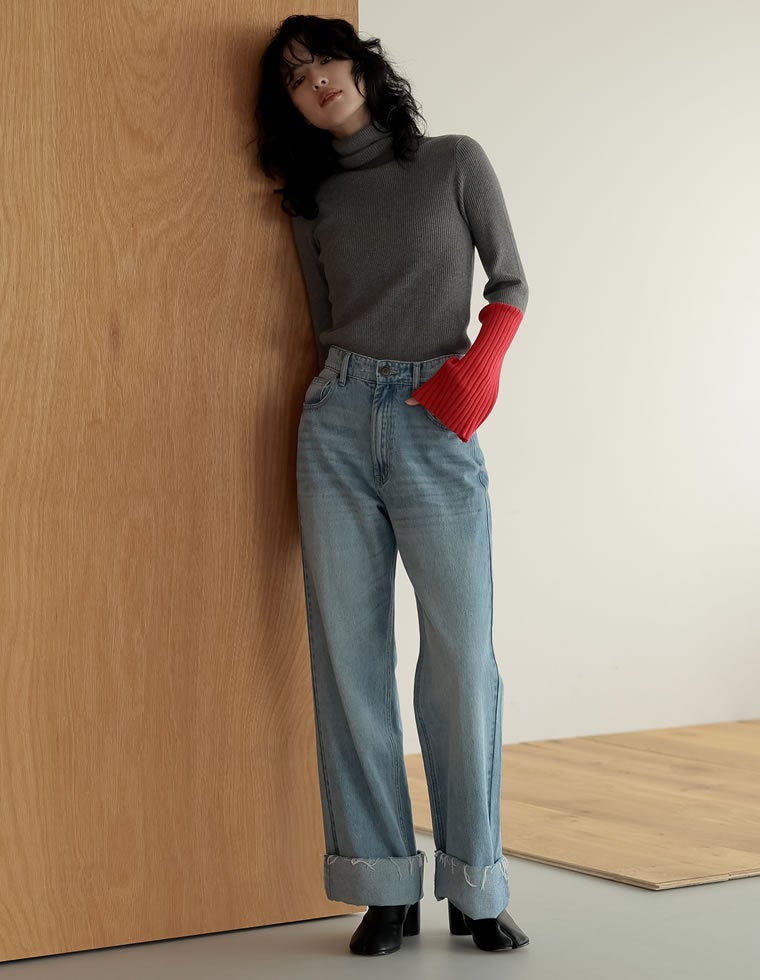 フレアスリーブデザインが旬な雰囲気を演出するハイネックニットトップス。
