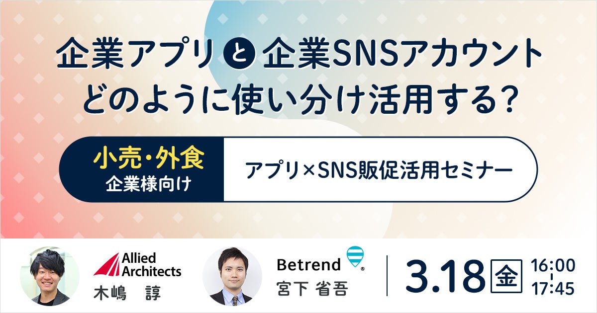 今回のオンラインセミナーでは、スマートCRMプラットフォーム「betrend」を提供し企業や店舗の販促を支援するビートレンド株式会社と、SNSプロモーション支援SaaS「echoes」を提供し企業のSNSマーケティング・販促活動を支援する当社が共同で、 小売・外食企業様を対象に、企業アプリと企業SNSアカウントの効果的な連携・活用方法を解説いたします。企業アプリや企業SNSアカウントの活用について、課題を感じていらっしゃる企業様、今後の導入を検討されている企業様はぜひご参加ください。