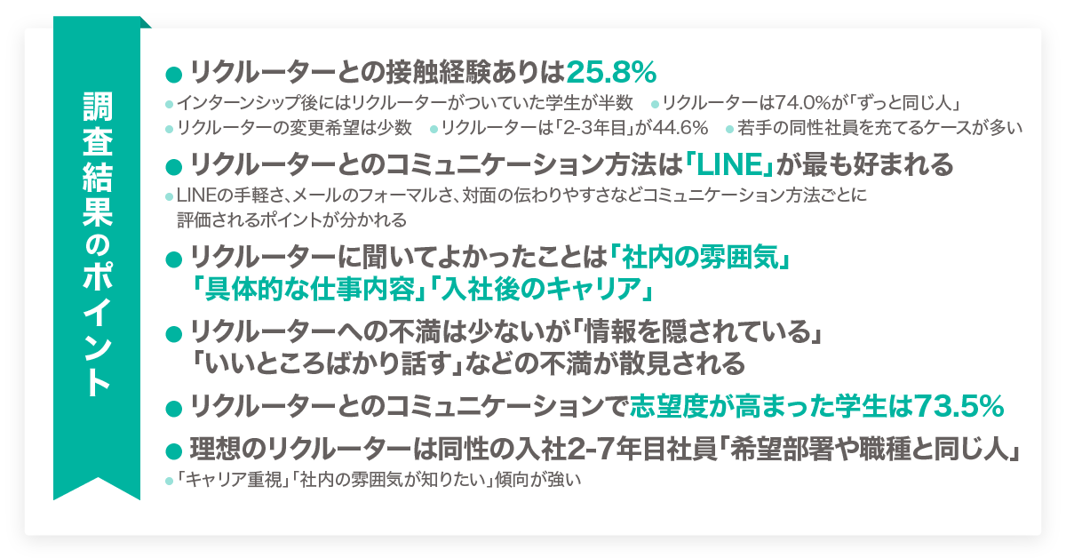 また、「選考を辞退する要因になった」1.5%、「その他(選考方法に疑問を抱いた、志望度が下がった)」1.0%などネガティブな反応はごく一部でした。リクルーターが就活生とコミュニケーションを図ることには、志望度を高める効果が見込めることがわかります。