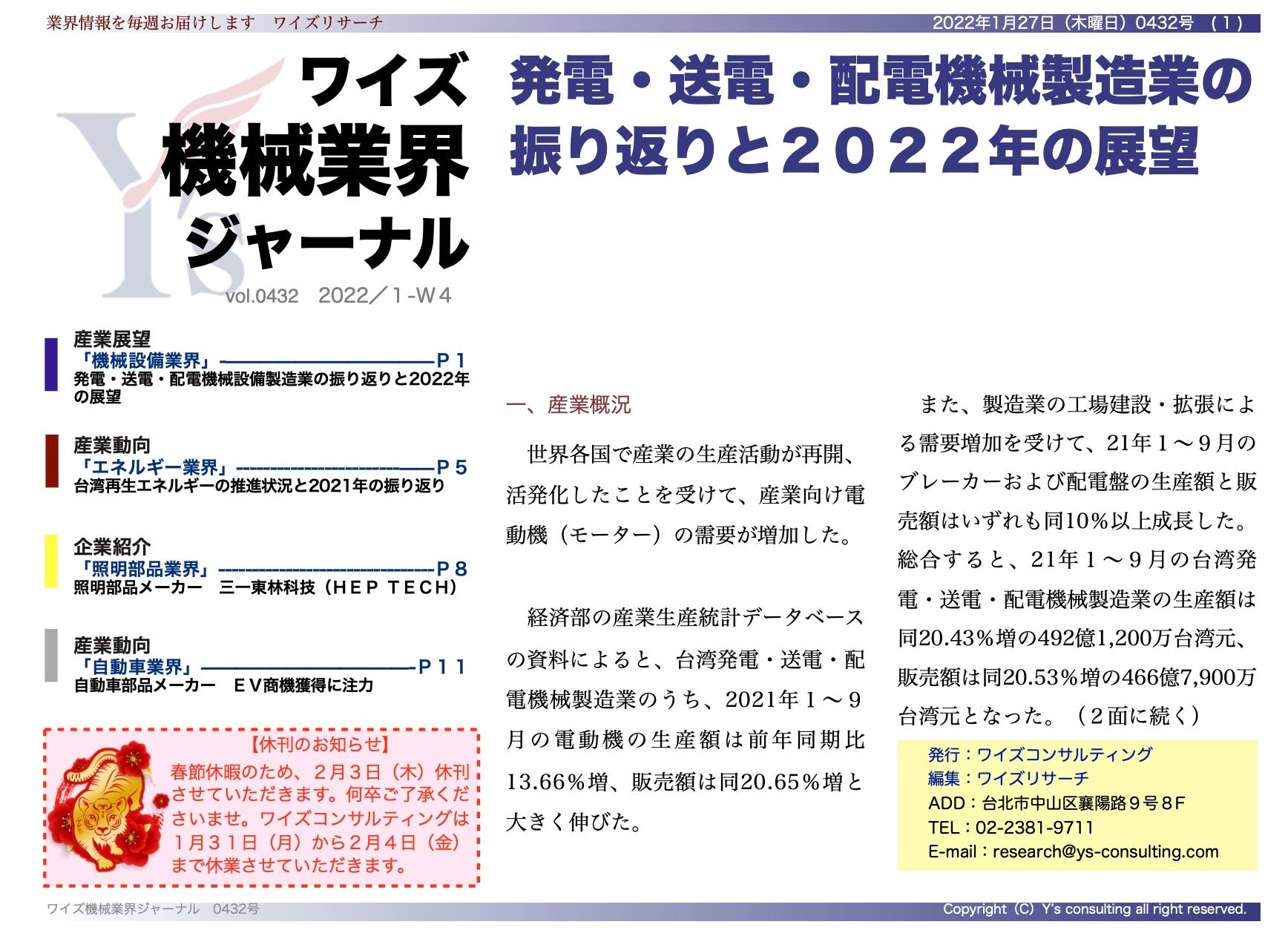 ワイズコンサルティング グループ(本社:中華民国台北市、代表取締役:吉本康志)は台湾機械業界専門誌「ワイズ機械業界ジャーナル」の2022年1月第4週号を発行しました。今週号では、機械設備業界、エネルギー業界、照明部品業界、自動車業界について紹介します。