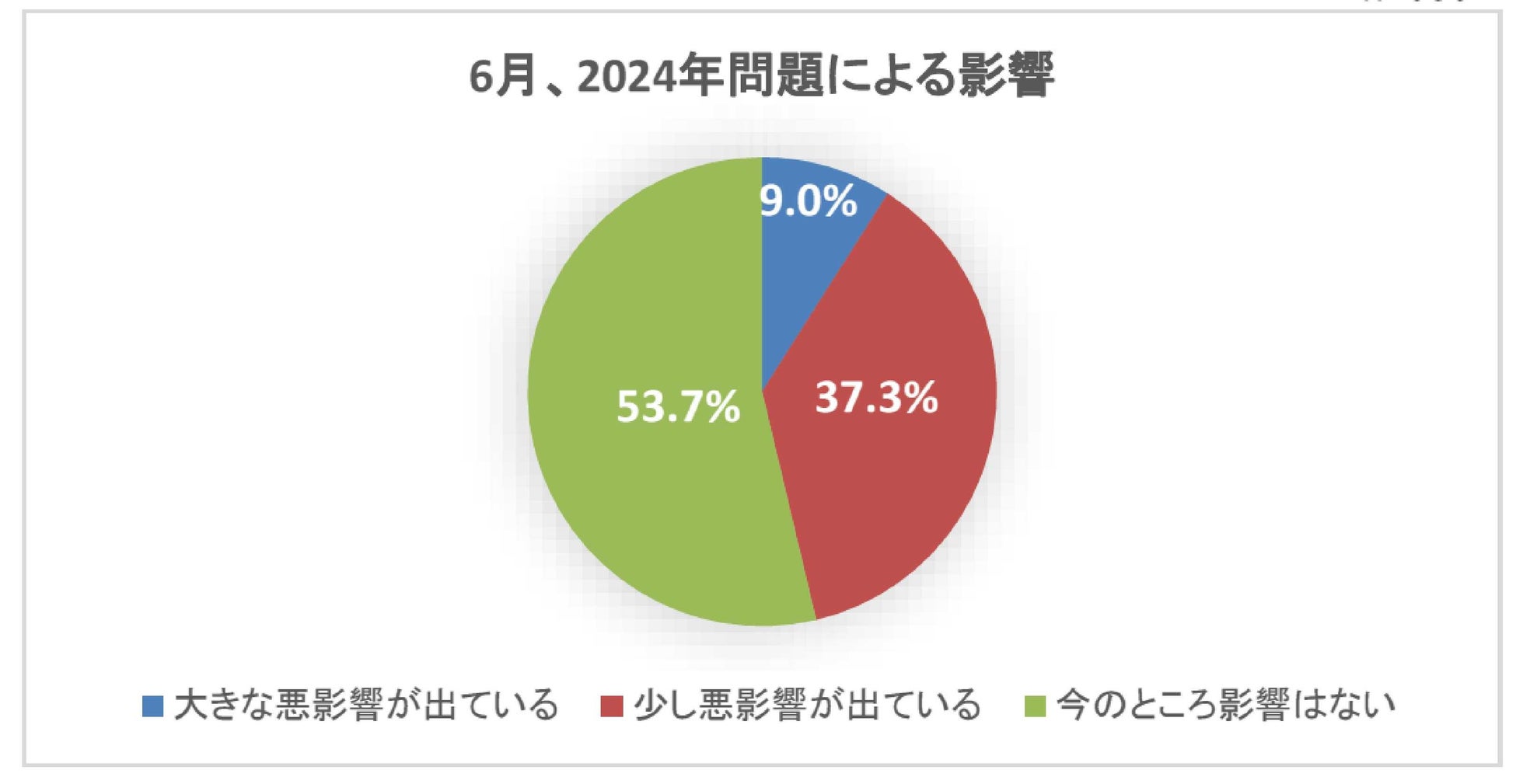 2024年問題による6月時点の影響では、悪影響が出ているのは46.3%となりました。特に製造業と卸売業では5割を超える企業に悪影響が出ています。また、その影響は「配送料の値上げ」が71.8%、「配達物の到着遅延」が32.1%となり、仕入価格の上昇に加え、配送コストの上昇が追い打ちをかけ、収益の確保に暗い影を落としています。