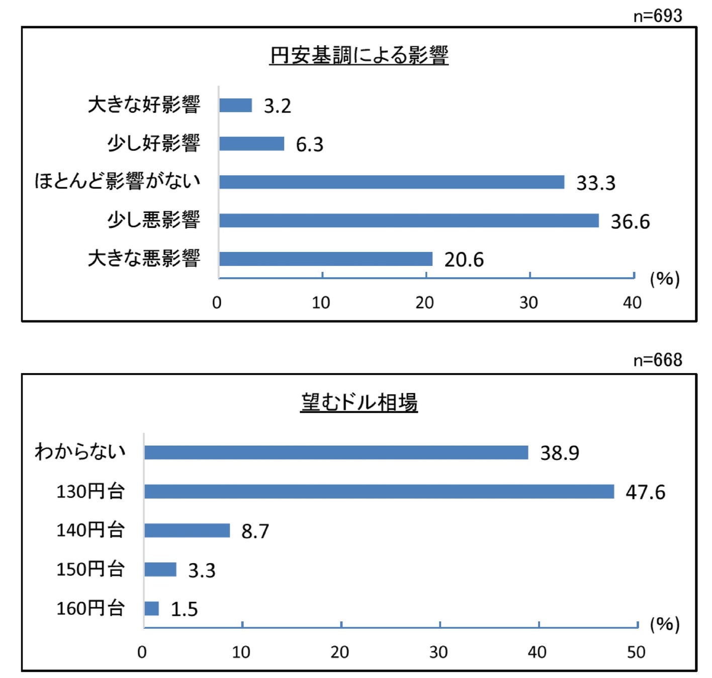 為替の円安基調は、約6割が悪影響があると回答し、影響がないのは33.3%に止まりました。また企業が望むドル相場は130円台が47.6%となりました。この円安基調は34.6%が1年超続くと考えており、輸入コスト解消には相当時間がかかると考えています。