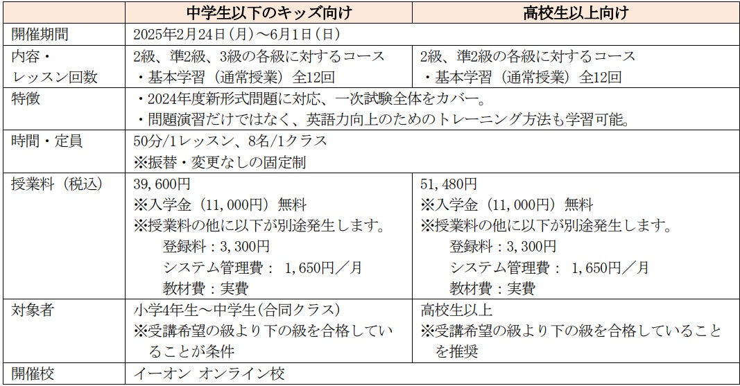 英会話教室を運営する株式会社イーオン(本社:東京都新宿区、代表取締役社長:重野卓、以下「イーオン」)は、オンライン校のキッズクラスと高校生以上クラスにおいて、「英検(R)対策 全12回オンラインコース」(以下、本コース)の2025年度第1タームを2025年1月24日(金)より受付開始します。