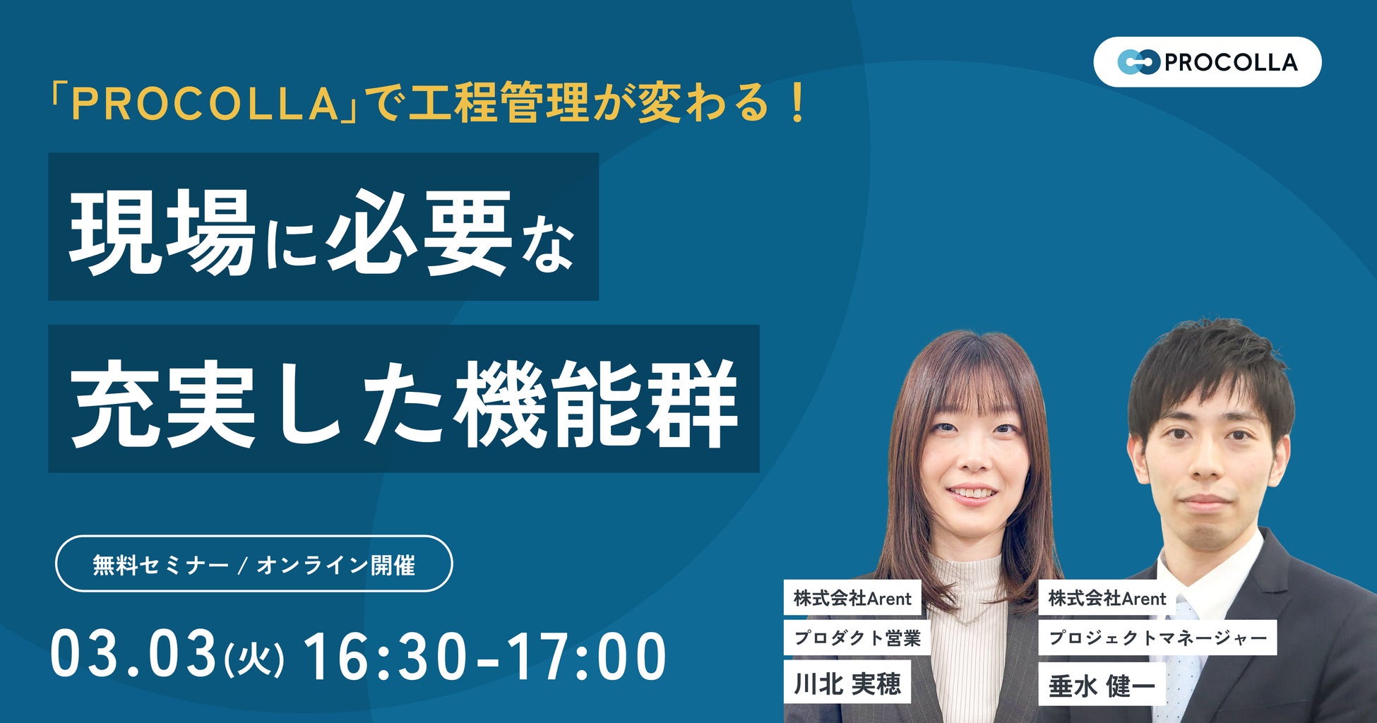 株式会社Arentは、2026年3月3日(火)に、「プロコラで工程管理が変わる~現場に必要な充実した機能群~」をテーマに、大林組と共同開発したAIクラウド工程管理システム「PROCOLLA(プロコラ)」の解説セミナーをオンラインにて開催します。