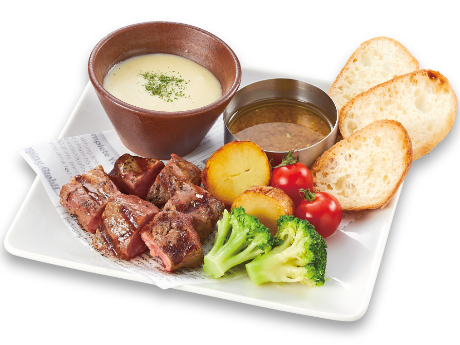 食べやすい大きさにカットしたステーキ、お野菜をチーズフォンデュで。