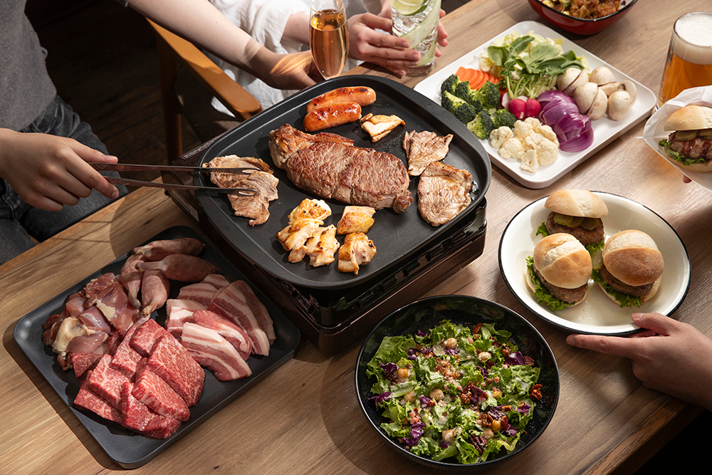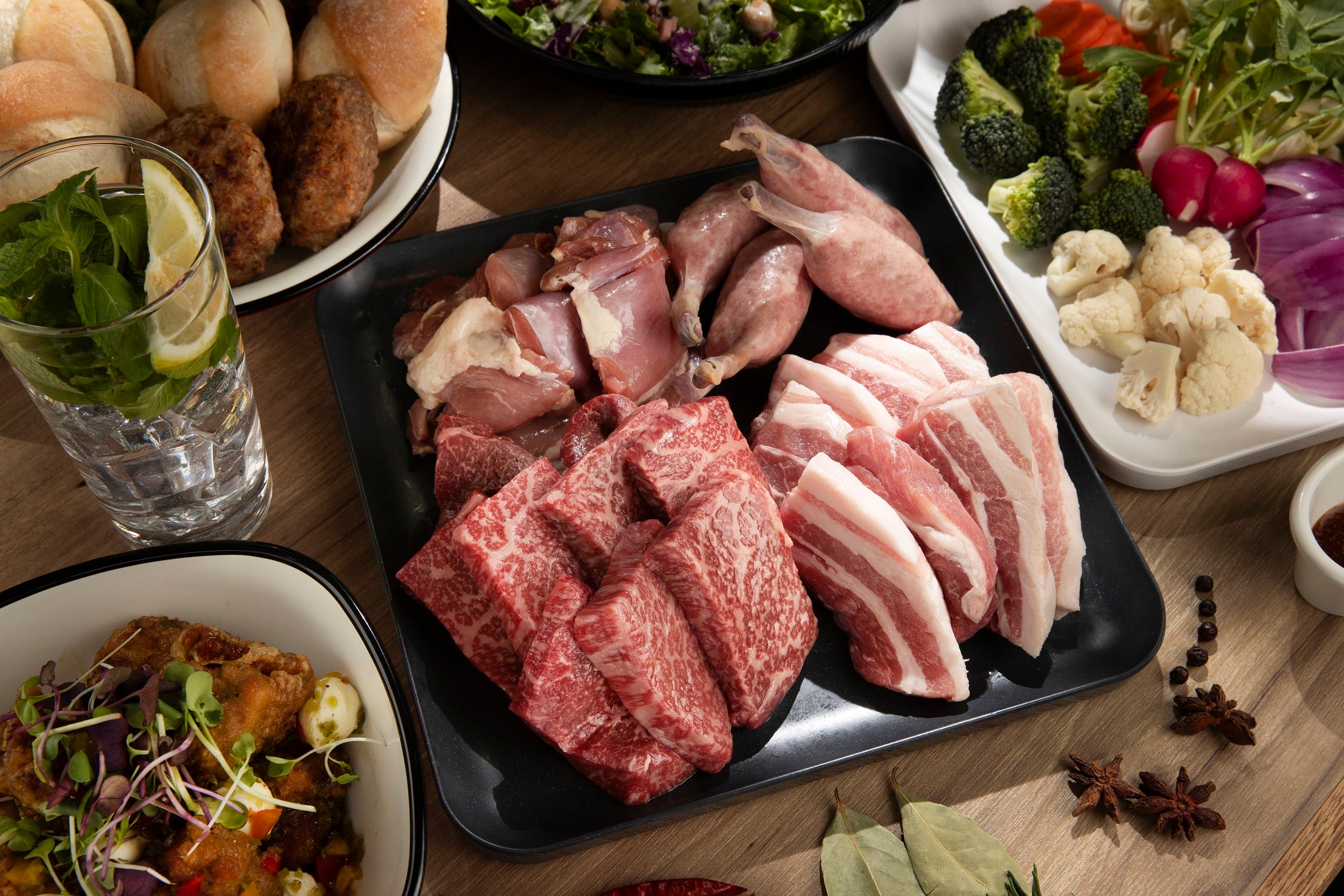(松阪牛、湘南みやじ豚バラ、奥久慈軍鶏モモ、骨付きフランク)