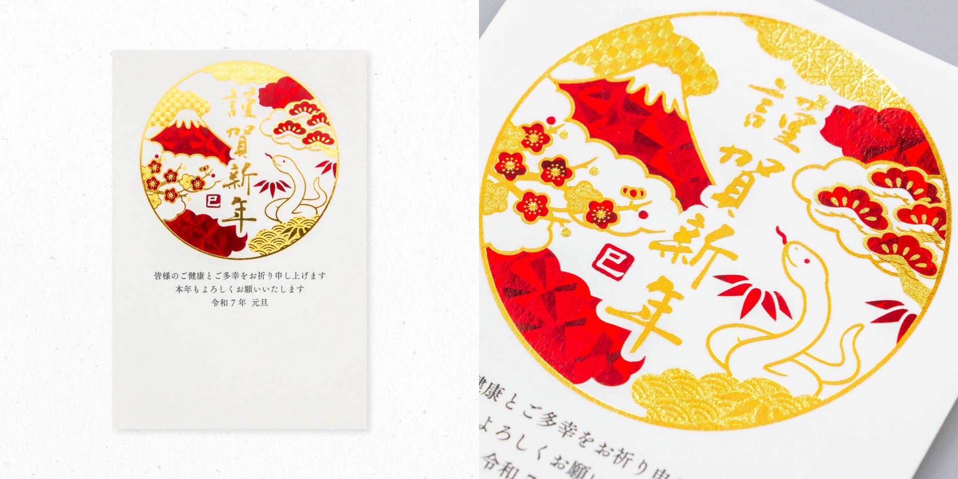 箔押しペーパーアイテムブランド「ROKKAKU」が織りなす箔押し加工の美しい年賀状です。
