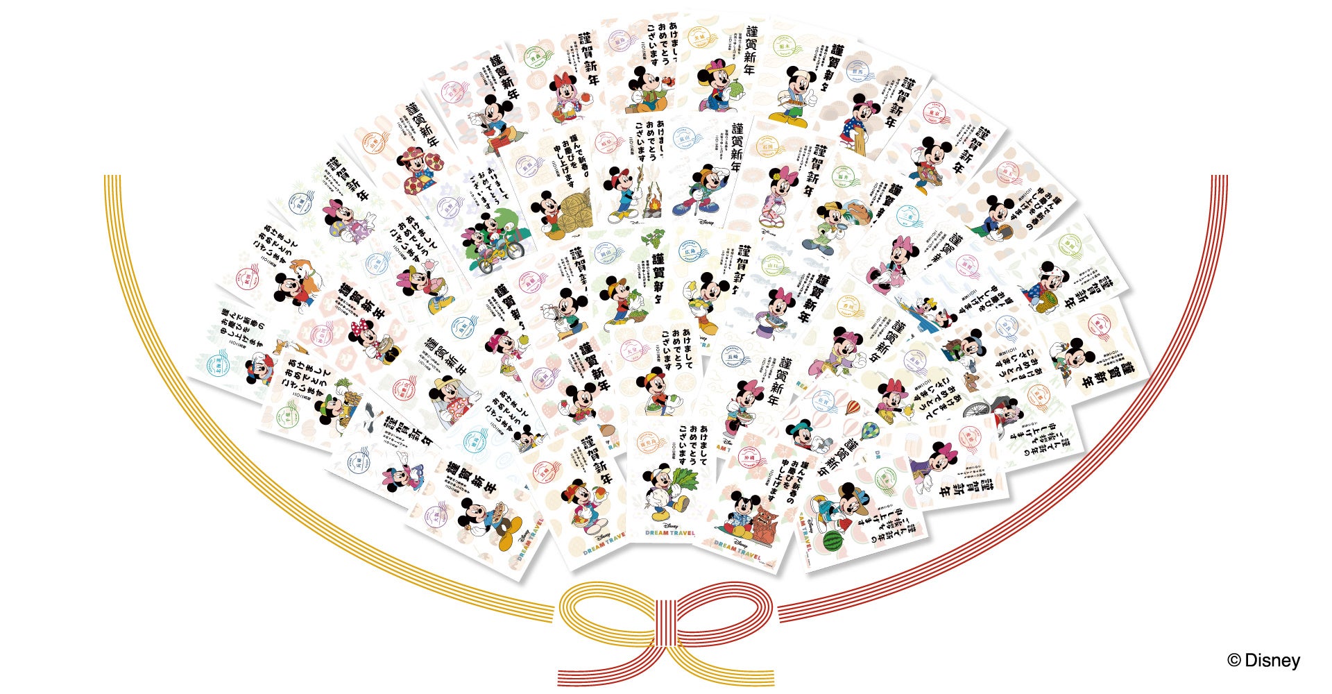 「ミッキー」と「ミニー」が日本全国に飛び回る「Disney Dream Travel」の各47都道府県ごとに異なるご当地ならではのアートを使用した年賀状です。
