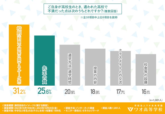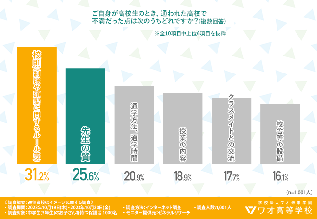 「ご自身が高校生のとき、通われた高校で不満だった点は次のうちどれですか。(複数回答)」と質問したところ、『校則(制服や頭髪に関するルール等)(31.2%)』と回答した方が最も多く、次いで『先生の質(25.6%)』『通学方法、通学時間(20.9%)』『授業の内容(18.9%)』『クラスメイトとの交流(17.7%)』と続きました。