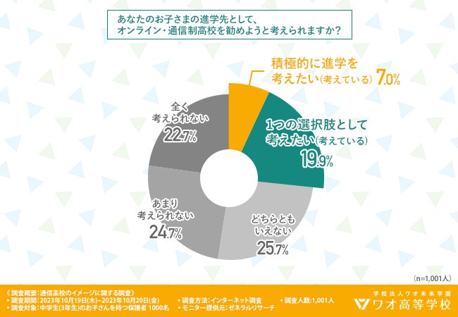 また、「あなたのお子さまの進学先として、オンライン・通信制高校を勧めようと考えられますか。」と質問したところ、『どちらともいえない(25.7%)』と回答した方に次いで『あまり考えられない(24.7%)』『全く考えられない(22.7%)』『1つの選択肢として考えたい(考えている)(19.9%)』『積極的に進学を考えたい(考えている)(7.0%)』と続きました。