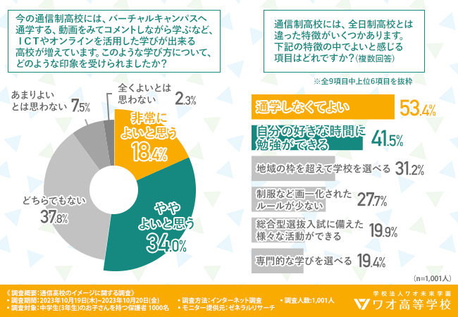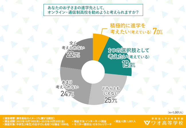 そこで、学校法人ワオ未来学園 ワオ高等学校(https://www.wao.ed.jp/)は、中学3年生のお子様を持つ保護者を対象に「通信制高校のイメージ」に関する調査を実施しました。