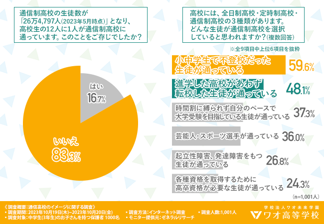 12人に1人が通信制高校に通っていることを知らない保護者が83%。抱いていたイメージと