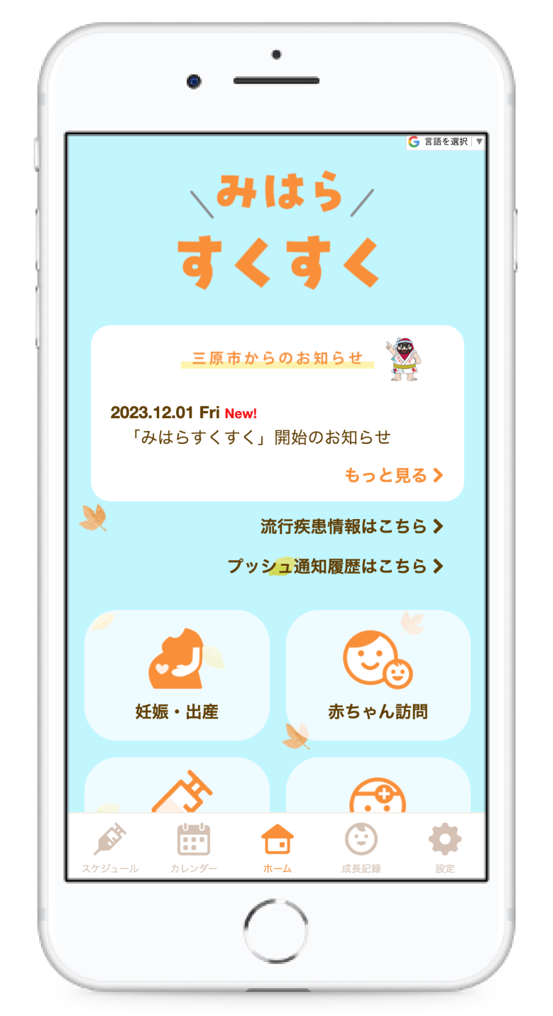 ライフスタイルの多様化による子育て世代のニーズの変化に伴い、一人一人のニーズに合わせた子育て情報の発信やプッシュ通知、簡便な予防接種スケジュールツールを提供するため、子育て支援アプリ「子育てモバイル」を導入する運びとなりました。三原市オリジナルのデザインを施し、子育て支援アプリ「みはらすくすく」として提供いたします。