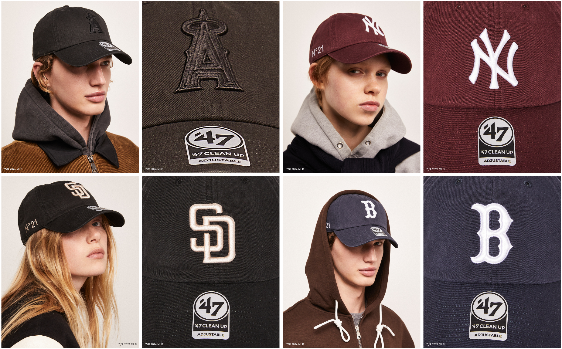 アメリカ・ボストンで1947年に設立された「'47」、多くの日本人選手が活躍する「MLB」と「N21」とのトリプルコラボレーションキャップ。浅めのクラウンとカーブしたバイザーが特徴的な人気のモデルCLEAN UP、肌さわりのよいウォッシュドコットン素材をベースに、ロサンゼルス・ドジャース(Los Angeles Dodgers)、ロサンゼルス・エンゼルス(Los Angeles Angels)、ニューヨーク・ヤンキース(New York Yankees)、サンディエゴ・パドレス(San Diego Padres)、ボストン・レッドソックス(Boston Red Sox)の5球団をフィーチャー。各球団ロゴに「N21」のロゴや「MLB」のエンブレム、ハートやローズモチーフをレイアウト。N21のキーカラー、ブラックとヌードベージュに置き換えたデザインも。