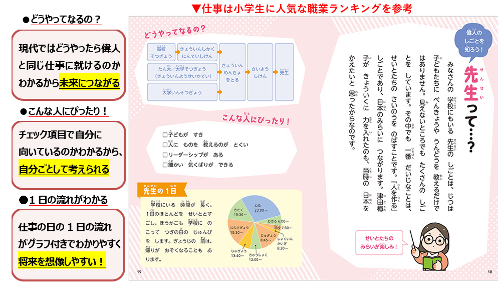 偉人の生い立ちを読んだ後に職業にふれ、偉人のおはなしを自分ごととしてとらえることで自然と将来を想像して夢と希望が膨らみます。
