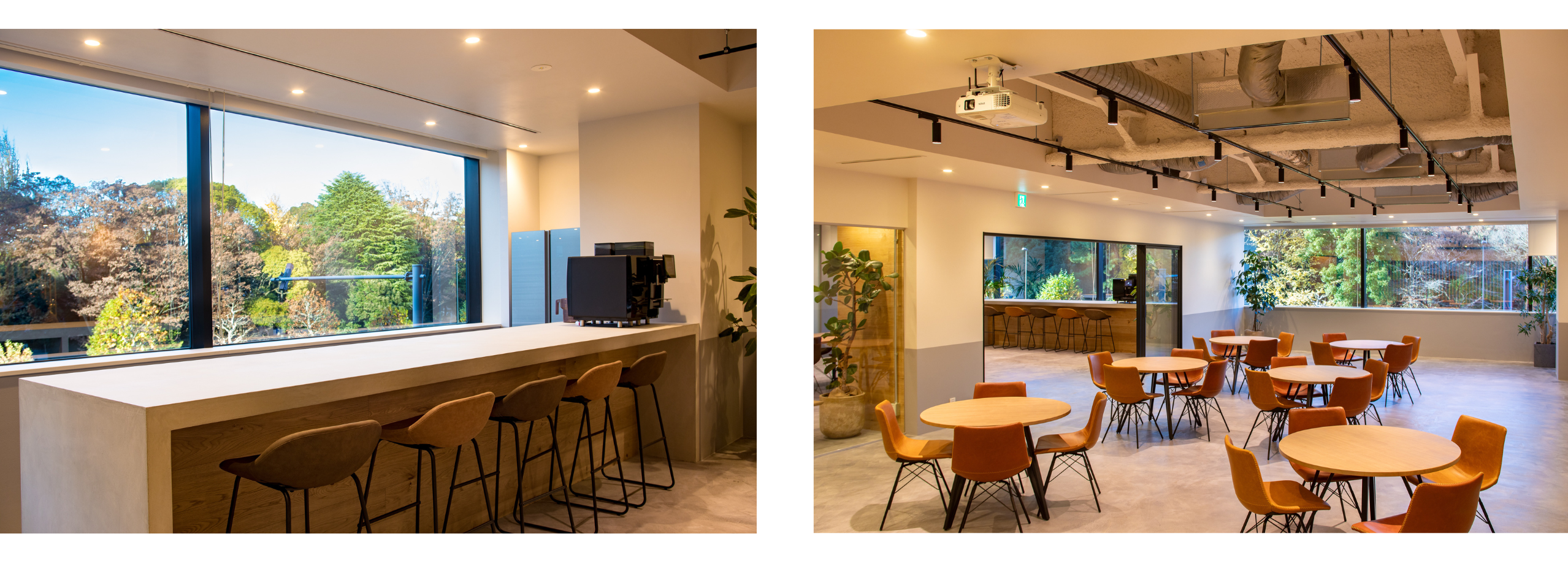赤坂御所の景観を臨むバーカウンター、大勢で食事ができるビッグテーブル、社員同士の交流を促進するカフェエリア、ちょっとした打ち合わせに対応できるソファーブース、リモート対応に最適なテレカンブース、コンセプト毎に設けられた大小様々な会議室。それぞれのフロアを繋ぐ回遊性のある通路は、各エリアを繋ぎ交流もスムーズになりました。