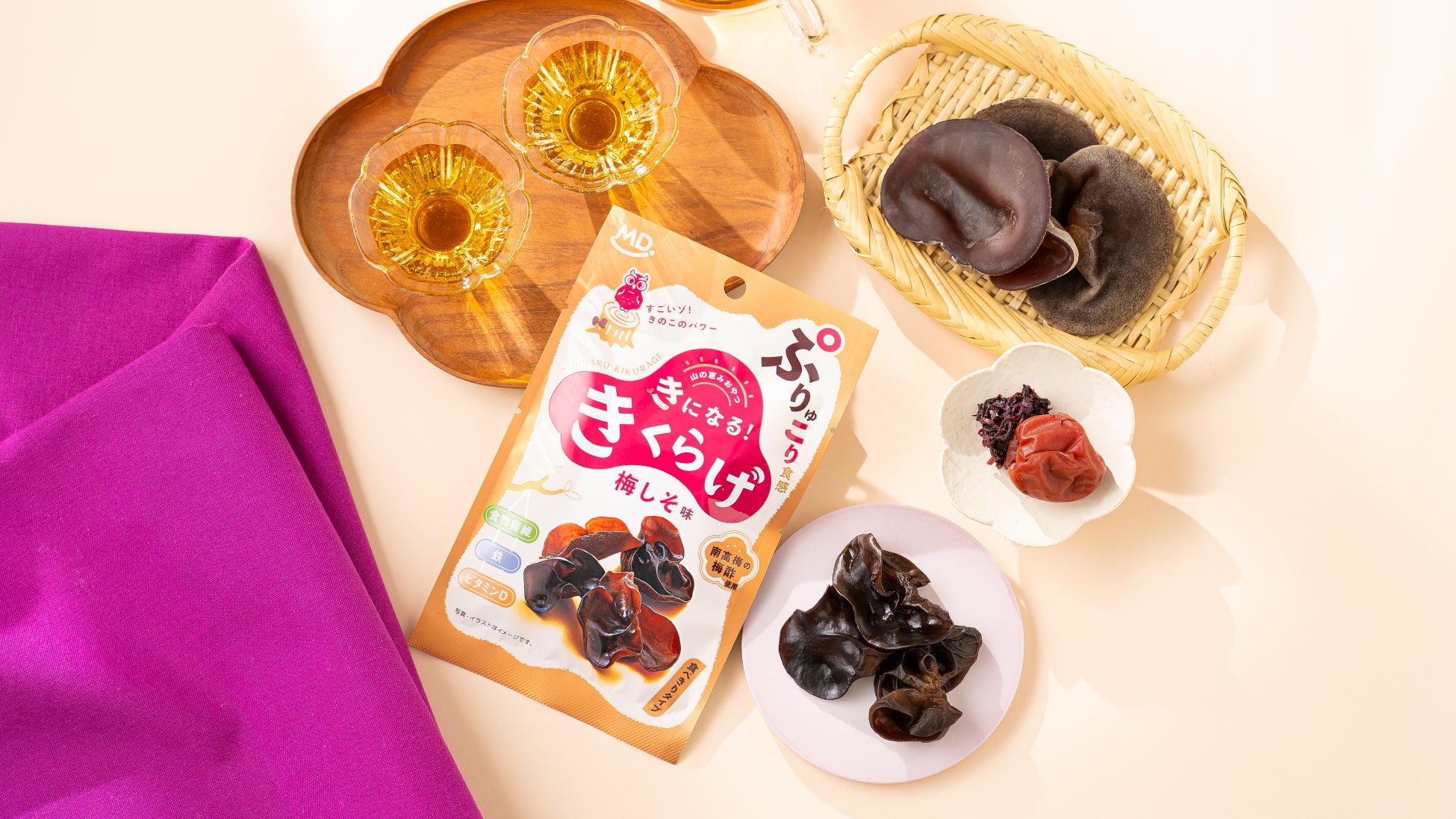『きになるきくらげ 梅しそ味』は、南高梅の梅酢を使用して、じっくり漬け込んだ“ぷりゅこり”食感のきくらげを、ひとくちサイズに仕上げた素材菓子です。ほどよい酸味としその爽やかな風味がバランスよく組み合わせることで、食感と味わいともに、飽きずに楽しめると、多くのお客様にご好評をいただいております。さらに、低脂質かつ、食物繊維・ビタミンDも豊富で、不足しがちな栄養素の鉄を含んでいることも特長です。