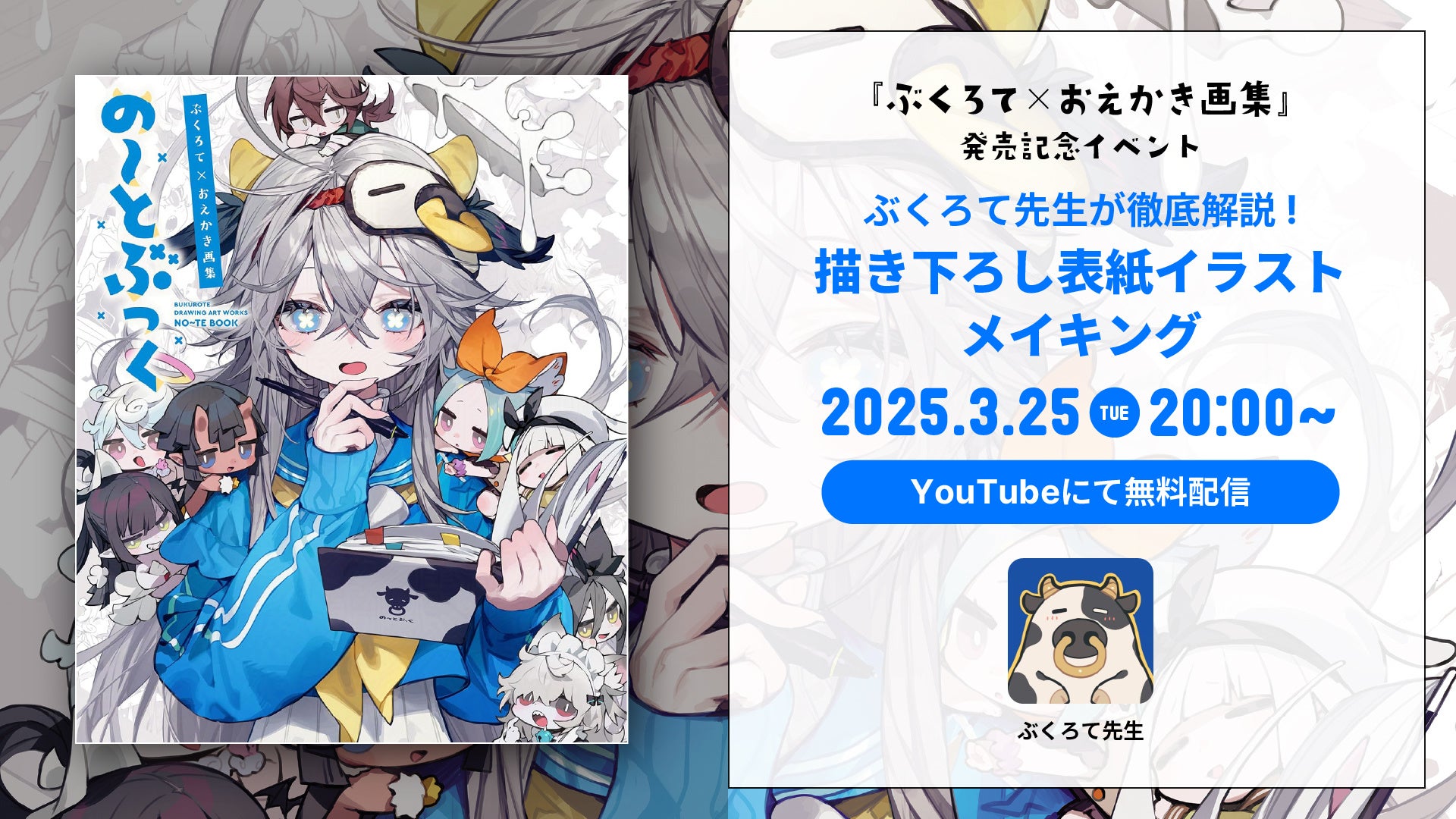 本イベントは、2025年3月31日(月)に発売予定の書籍『ぶくろて×おえかき画集 の〜とぶっく』の刊行を記念して実施されるもので、著者のぶくろて先生自らが描き下ろした表紙イラストの制作過程をYouTubeライブで解説いたします。ご興味のある方はぜひご視聴ください。