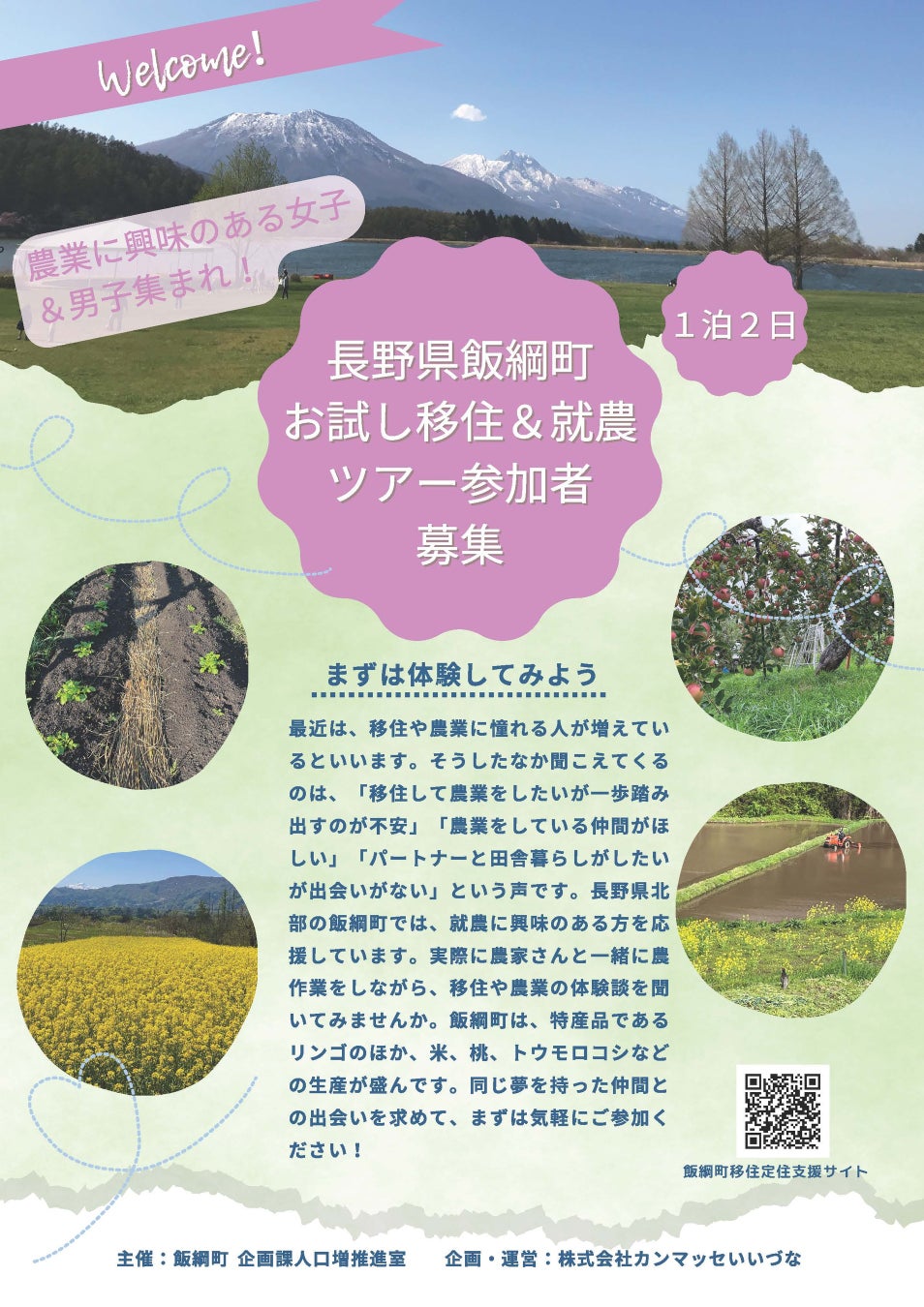 長野県飯綱町は、令和5年8月25日(金)~26日(土)に「お試し移住・就農ツアー」を開催します。都心部に暮らす若者の移住への関心が高まるなか、地方では農業従事者の高齢化が進み、後継者不足の問題が深刻化しています。そこで飯綱町では、移住や就農に興味のある独身男女が、農業体験や先輩移住者・就農者との交流、新規就農支援の説明会等をおこなうツアーを実施します。農業を通じた仲間との出会いの場を設けることにより、将来的には人口および就農者の増加につなげていくことができればと期待しています。