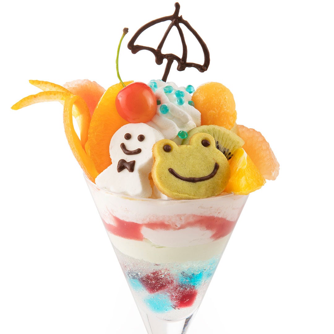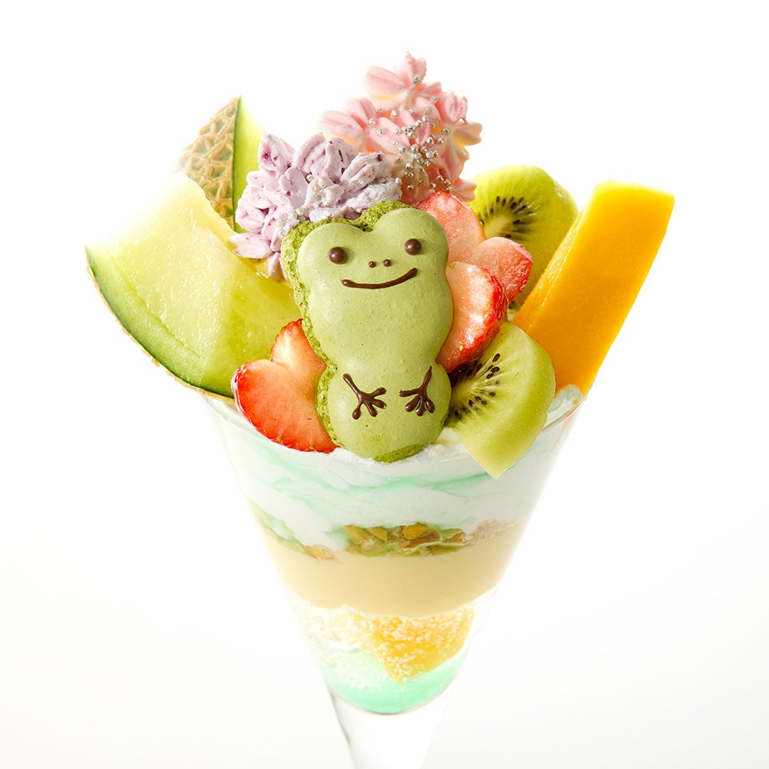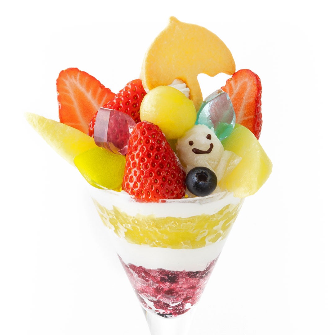 雨の多いこの季節でも気分が晴れるようにと、フルーツのさわやかさを生かしたパフェをご用意しました。紫陽花、カエル、てるてる坊主、傘、雫などをモチーフにし、店舗ごとにデザインの違う全6種類のパフェが登場します。