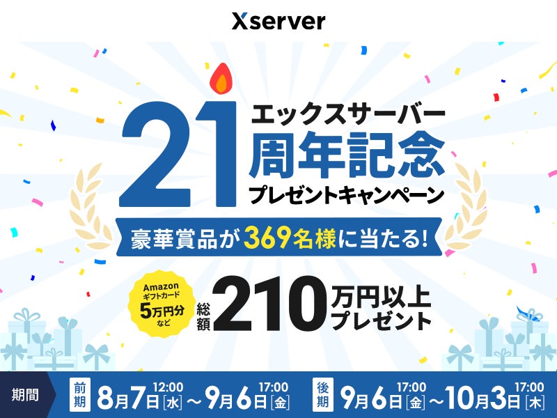 エックスサーバー株式会社(所在地:大阪市北区、代表取締役:小林 尚希)は、2024年8月7日(水)から2024年10月3日(木)まで、同社が提供するサービスの契約者を対象として、5万円分のAmazonギフトカードや、3万円分の Uber Eats ギフトカードなど総額210万円以上の豪華賞品が抽選で369名様に当たる「21周年記念プレゼントキャンペーン」を開催します。