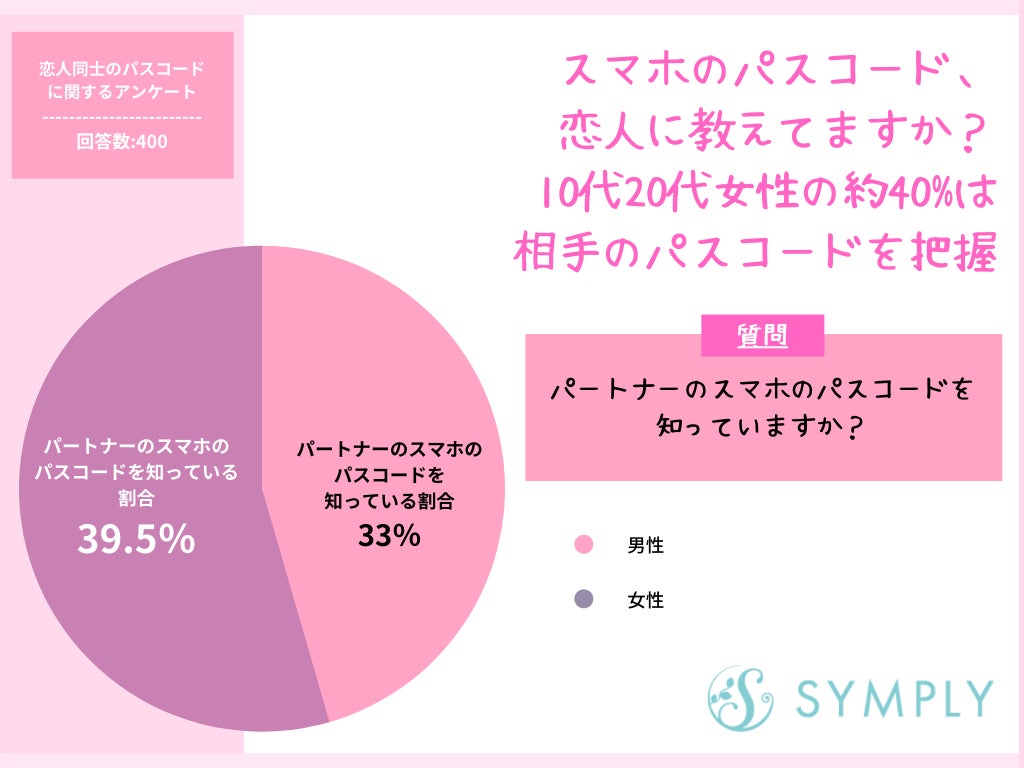 SYMPLY[シンプリー]では、10代~20代男女の400人を対象に「パートナーのスマホのパスコードを知っていますか?」というアンケート調査を実施。同調査をもとに、パートナーのスマホのパスコードを知っていると回答した男女別の割合、そして、パートナーとスマホのパスコードを共有している割合についてご紹介します!