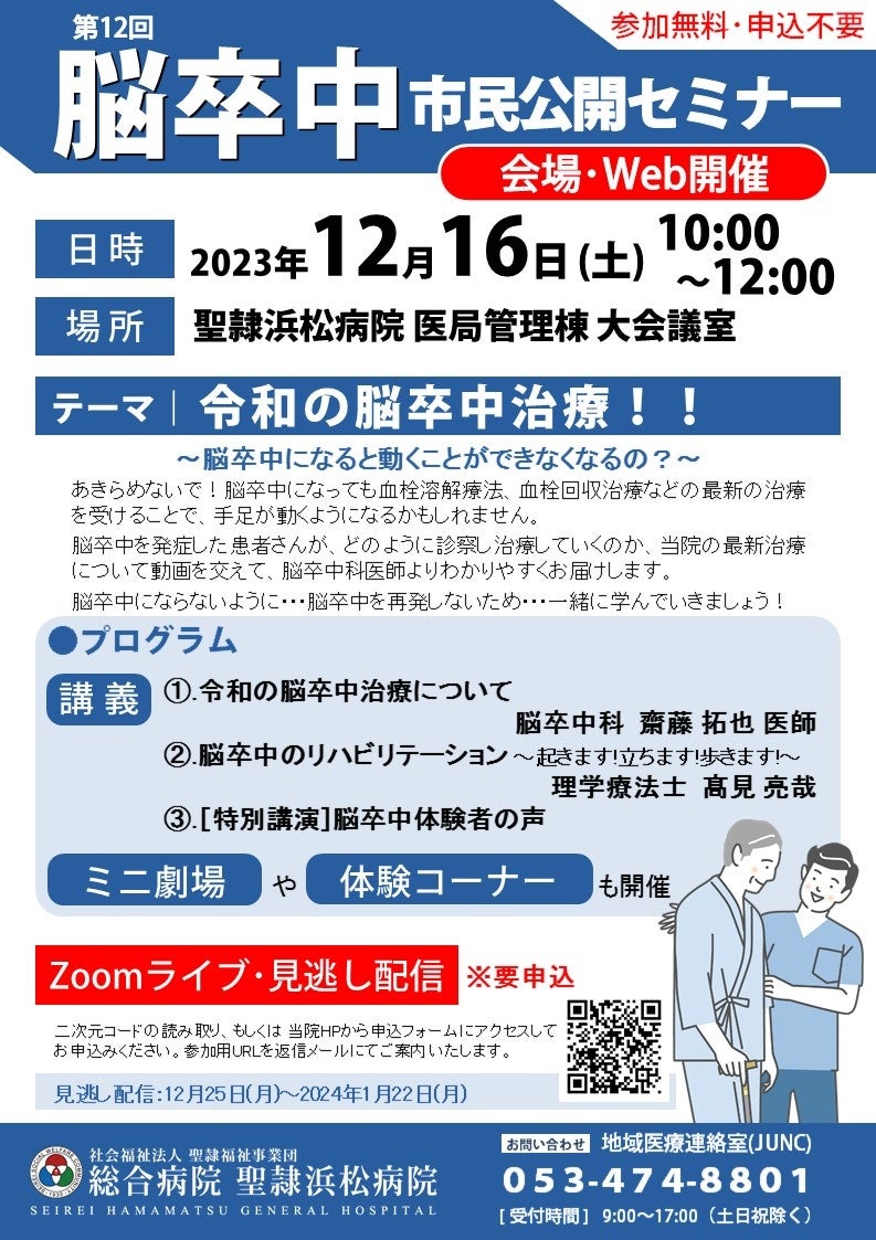 【12月16日(土)10時】「聖隷浜松病院脳卒中市民公開セミナー」開催 医師らによる講演 ミニ劇場・体験コーナーも実施
