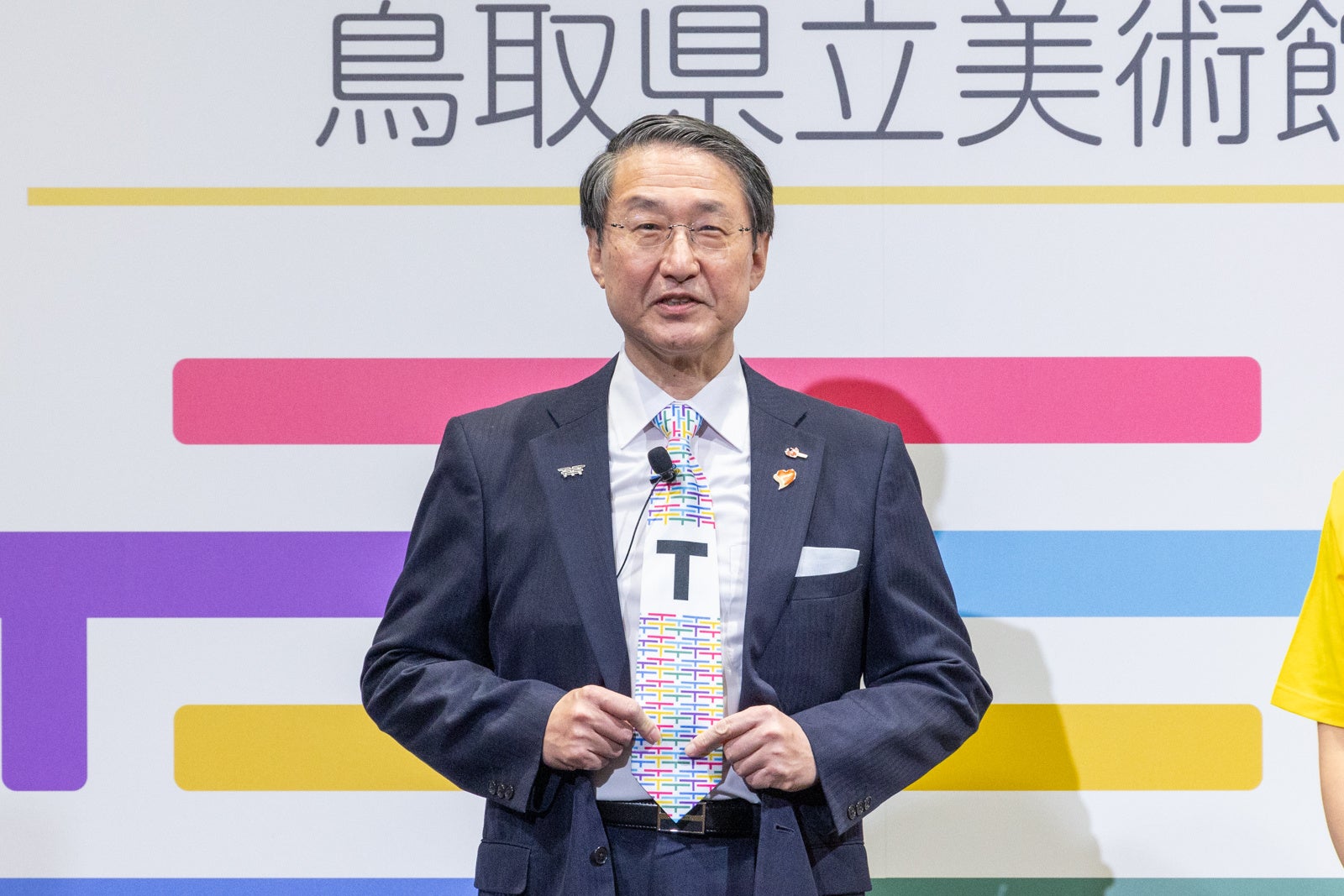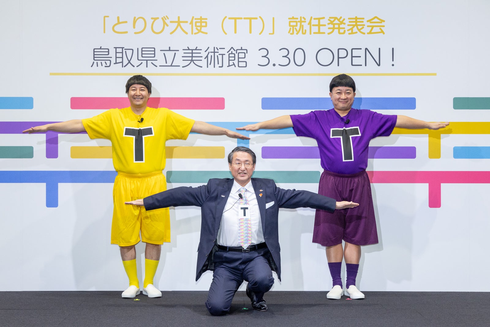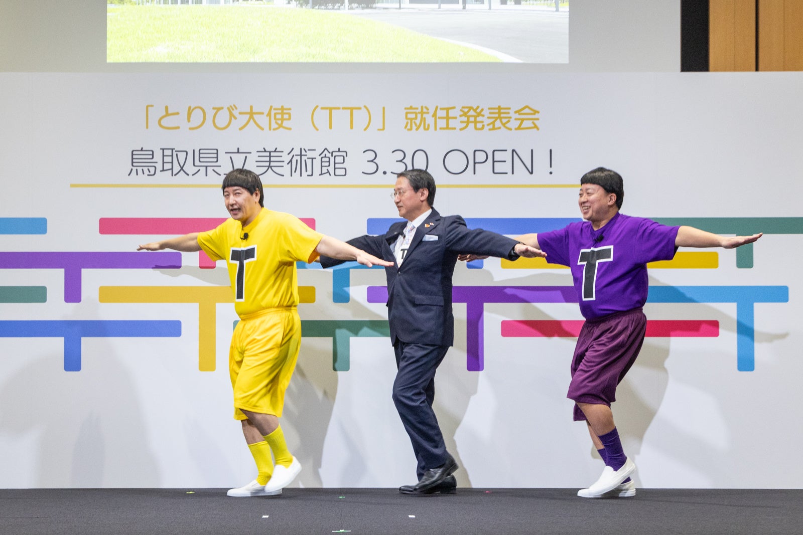 最後に「T」づくしの発表会に、長田さんから「気分が上がって、ティかぶっています(高ぶっています)!」とツッコミがはいりました。今後の「とりび大使(TT)」としての意気込みについてコメントを求められると、長田さんは「鳥取県立美術館はアーティ(アート)で、Tがたくさん見られるので、ぜひ皆さんに来ていただきたいと思います。」。松尾さんは、「鳥取には、アーティ(アート)だけでなく、美味しいティべ物(食べ物)などもあるので、遊びに来ていただけたら嬉しいです。」とコメントし、最後まで会場を盛り上げました。平井知事は「鳥取県立美術館のオープンを、TT兄弟さんと一緒に迎えることができて、本当にありがティ(ありがたい)です。ギャラリーと変わる(ガラリと変わる)新たなティッティリ(鳥取)県の旅立ちをおふたりとともに盛り上げていきたい。」と3月29日(土)に鳥取県倉吉市で開催される、鳥取県立美術館の開館記念オープニングイベントでの再会を誓いました。