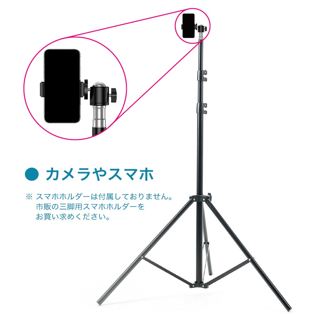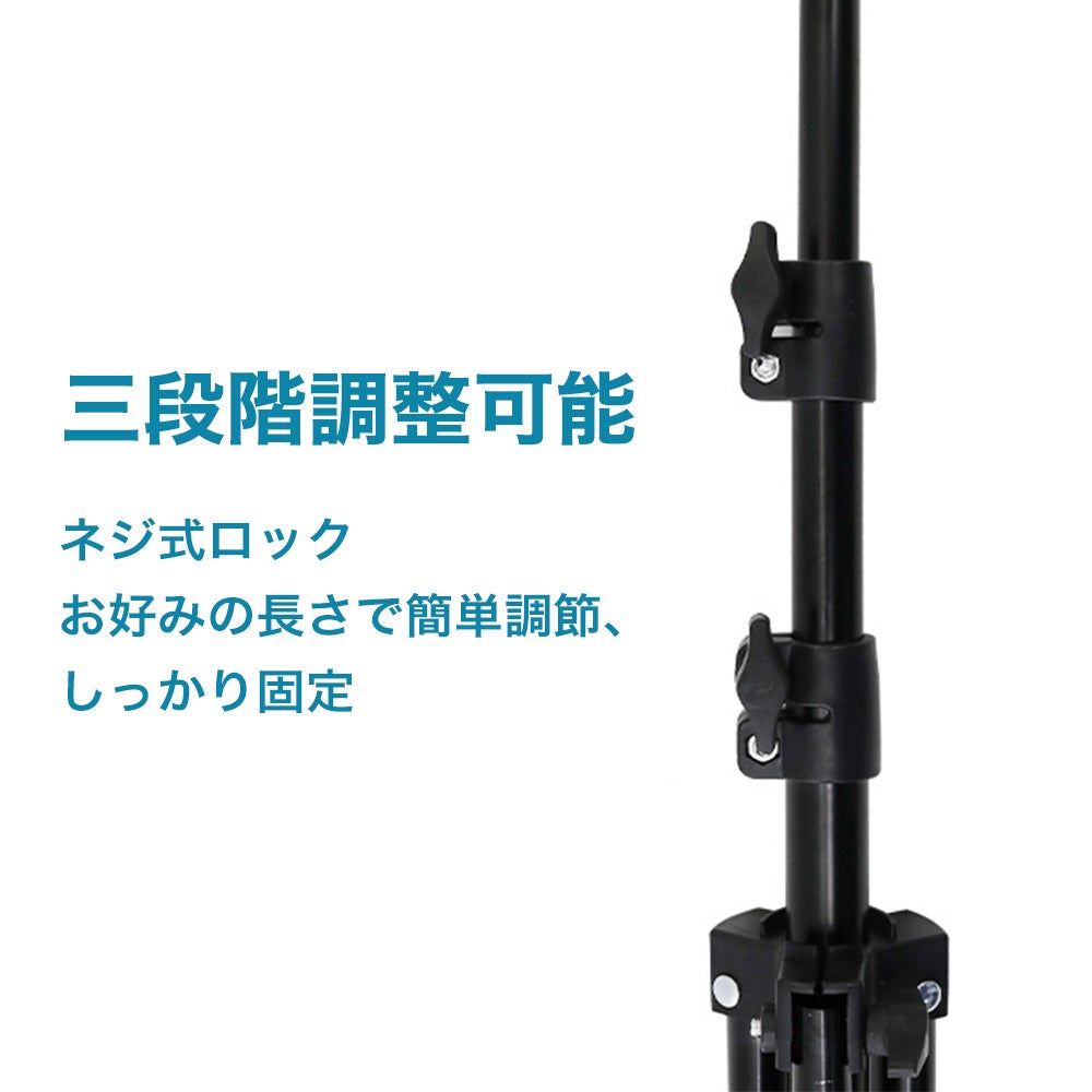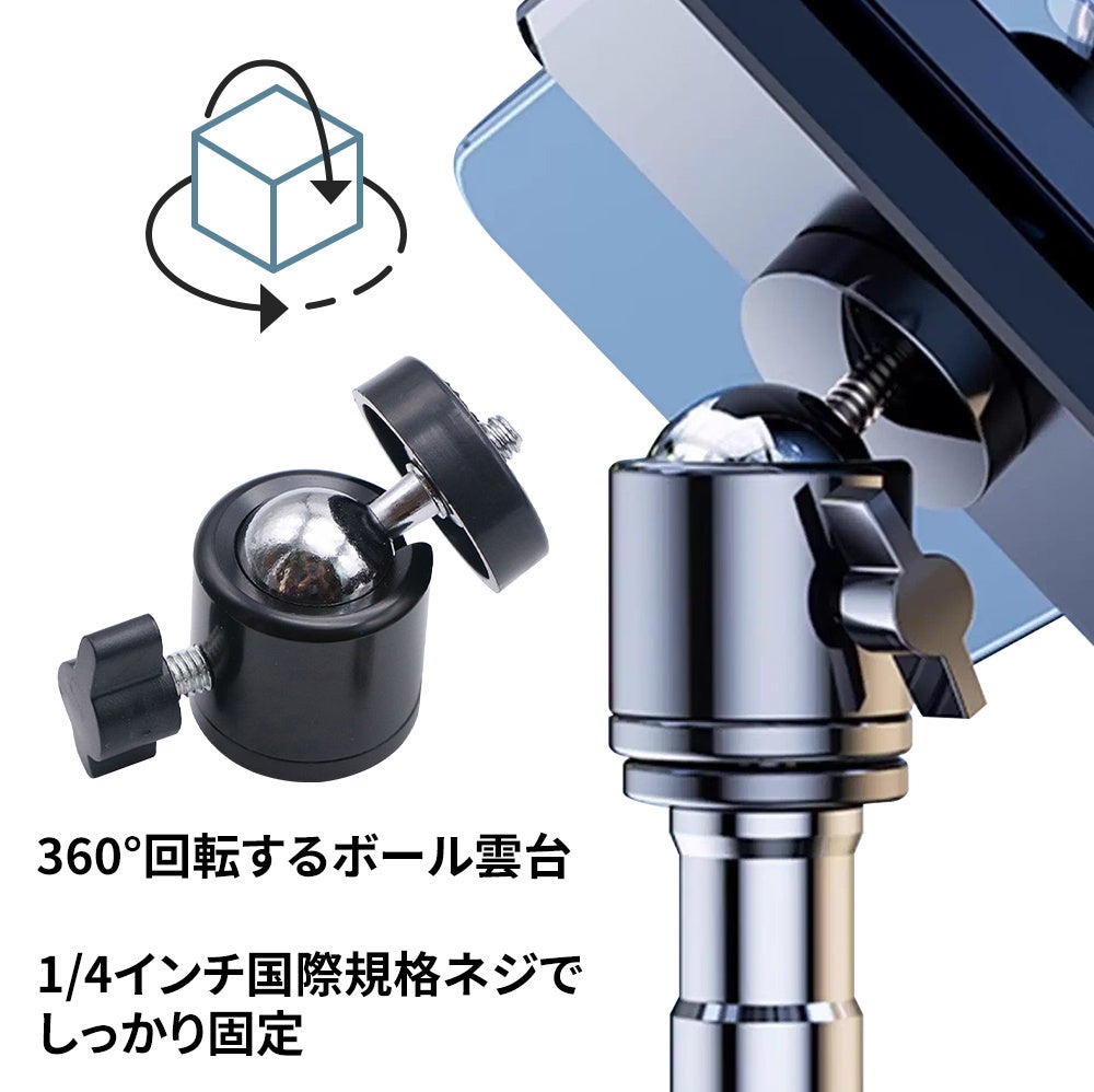 3段階伸縮で54~160cmまでの高さを調節でき、取り付け部分は新たに360度回転するボール雲台を採用し、角度も細かく調節できる仕様となりました。1/4インチ国際規格ネジなので、市販のデジカメやスマホホルダー、熱中症指数計など多くの機器に対応しています。