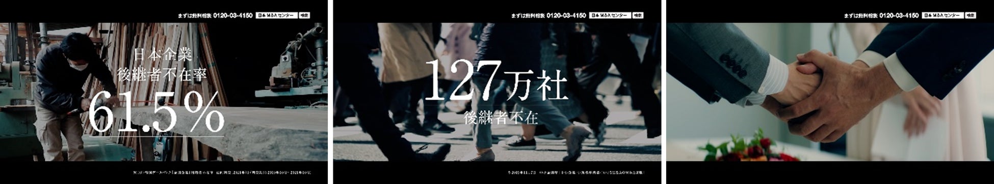 経営者の高齢化、昨今はコロナ禍による経営不振など日本の企業をとりまく環境は日々変化しています。今回のテレビCMでは、「後継者不在率61.5%※1」、「後継者不在127万社※2」という日本企業の抱える課題を、数字で正確にお伝えし、事業承継を遠い未来のことではなく喫緊の課題と捉えていただくと共に、長年この課題に向き合ってきた日本M&Aセンターの取り組みをお伝えします。