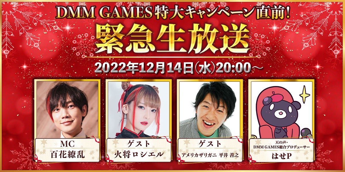 2022年12月14日(水)20時00分より、人気コスプレイヤー「火将ロシエル」、お笑い芸人アメリカザリガニ「平井 善之」、モンスター娘TDなどのゲームを生み出したDMM GAMES総合プロデューサー「はせP」、そしてMC「百花繚乱」と豪華ゲストでお届けいたします。