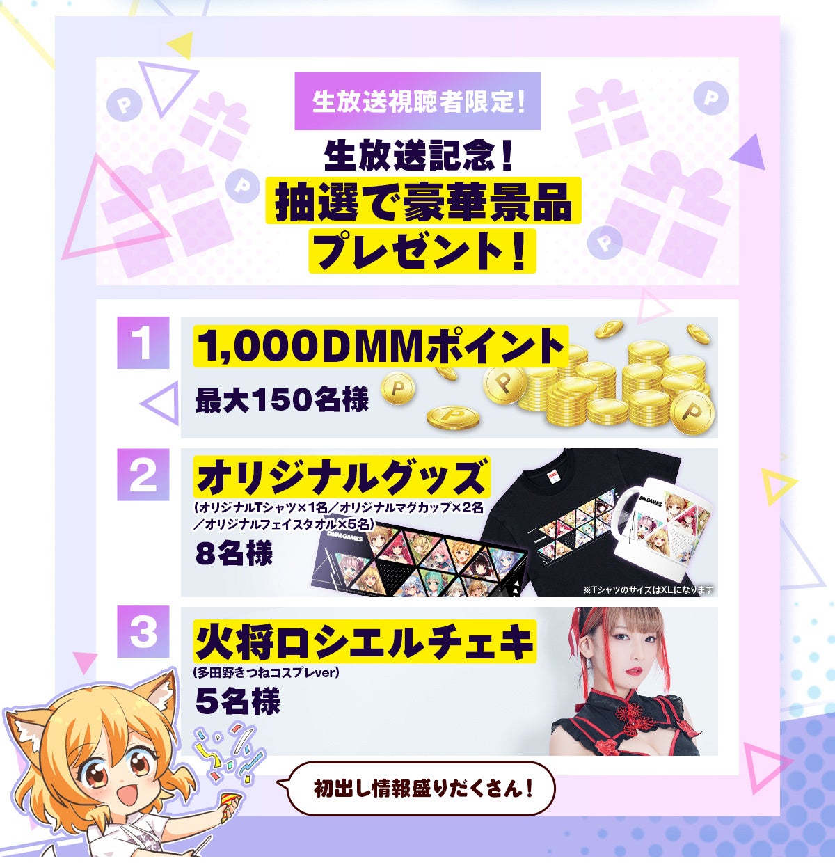 生放送ではYouTubeより視聴したDMM会員様だけが参加できるプレゼントキャンペーンや、放送中には視聴者の皆さんに参加していただけるコーナーもあります。