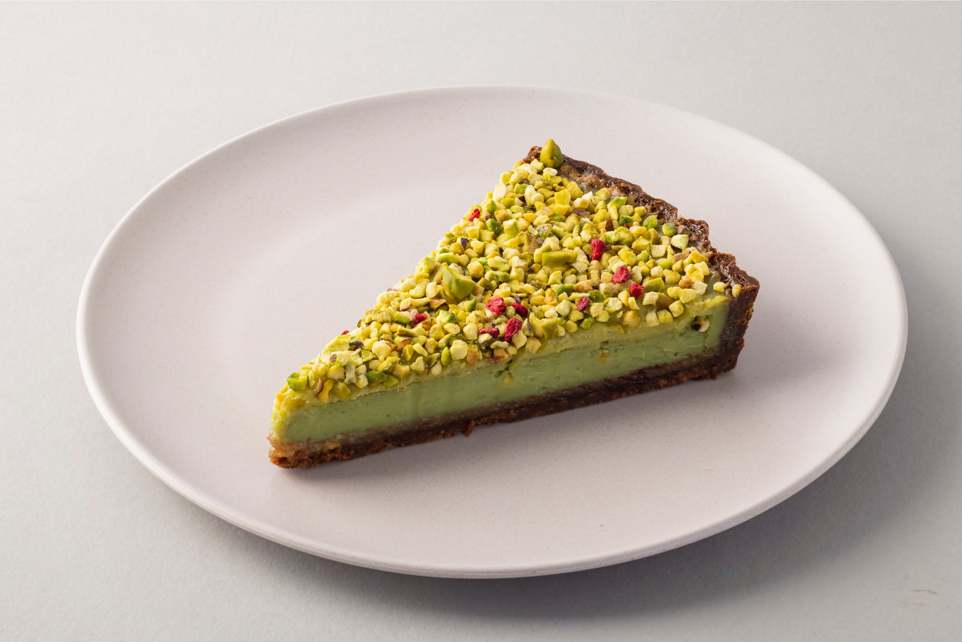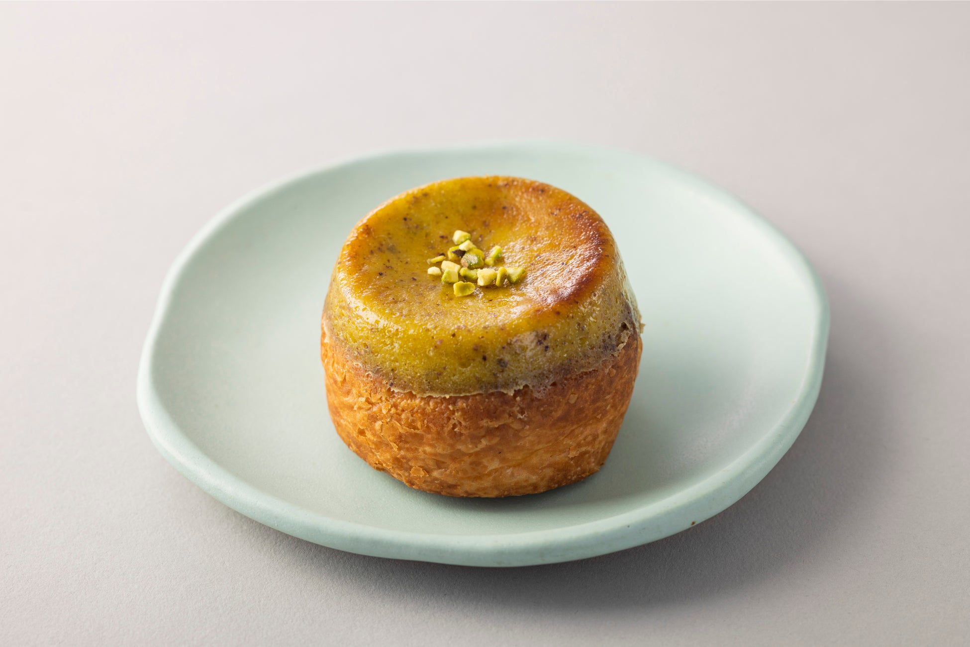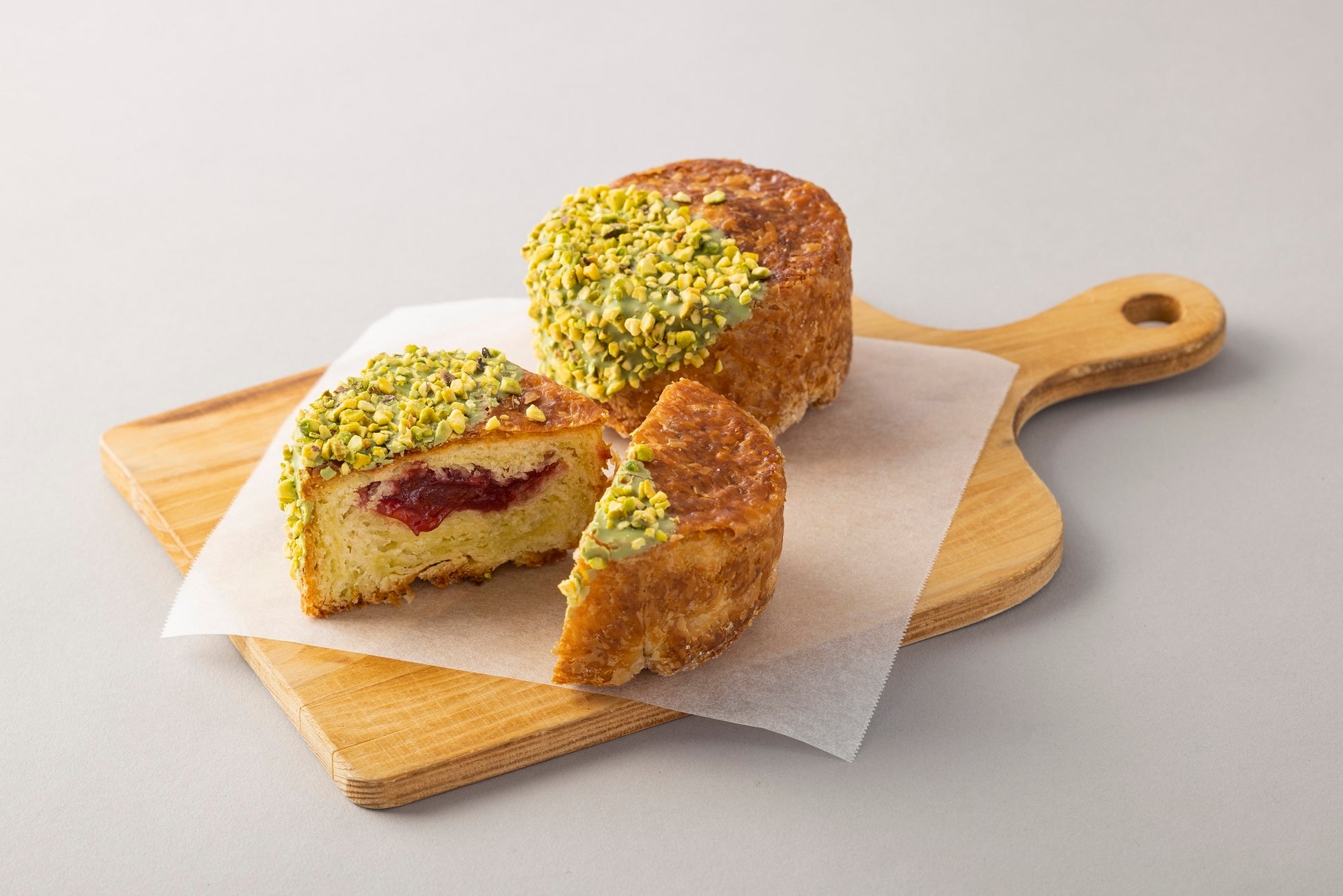 芳醇なバターが香る生地に甘酸っぱいフランボワーズのフィリングをたっぷりと包み、風味豊かなピスタチオダイスをトッピングしました。