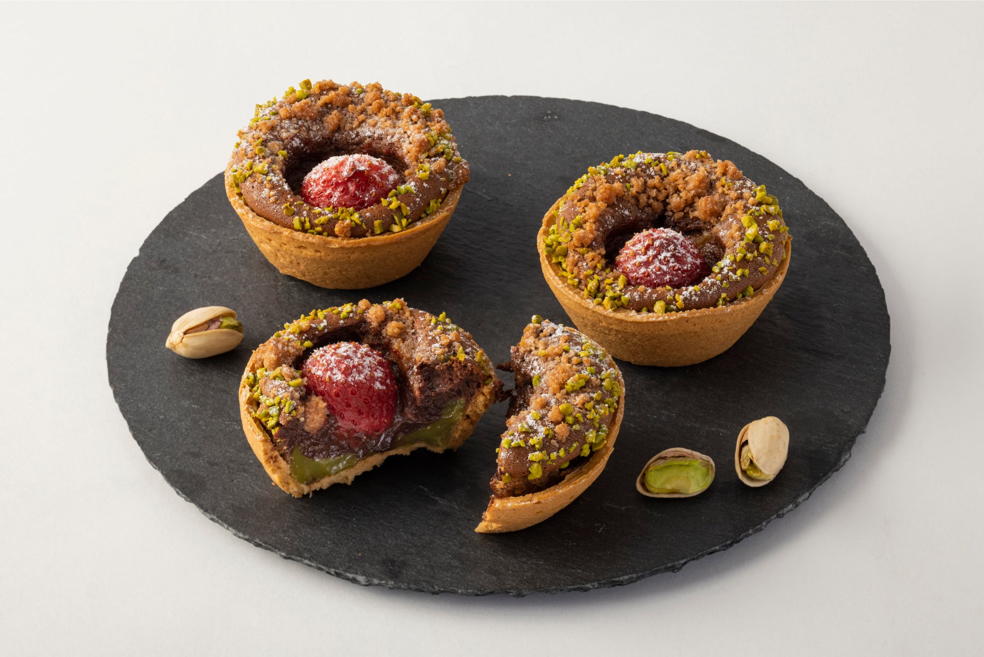 ピスタチオガナッシュとベリーソースを忍ばせた滑らかな食感のフォンダンショコラタルトです。
