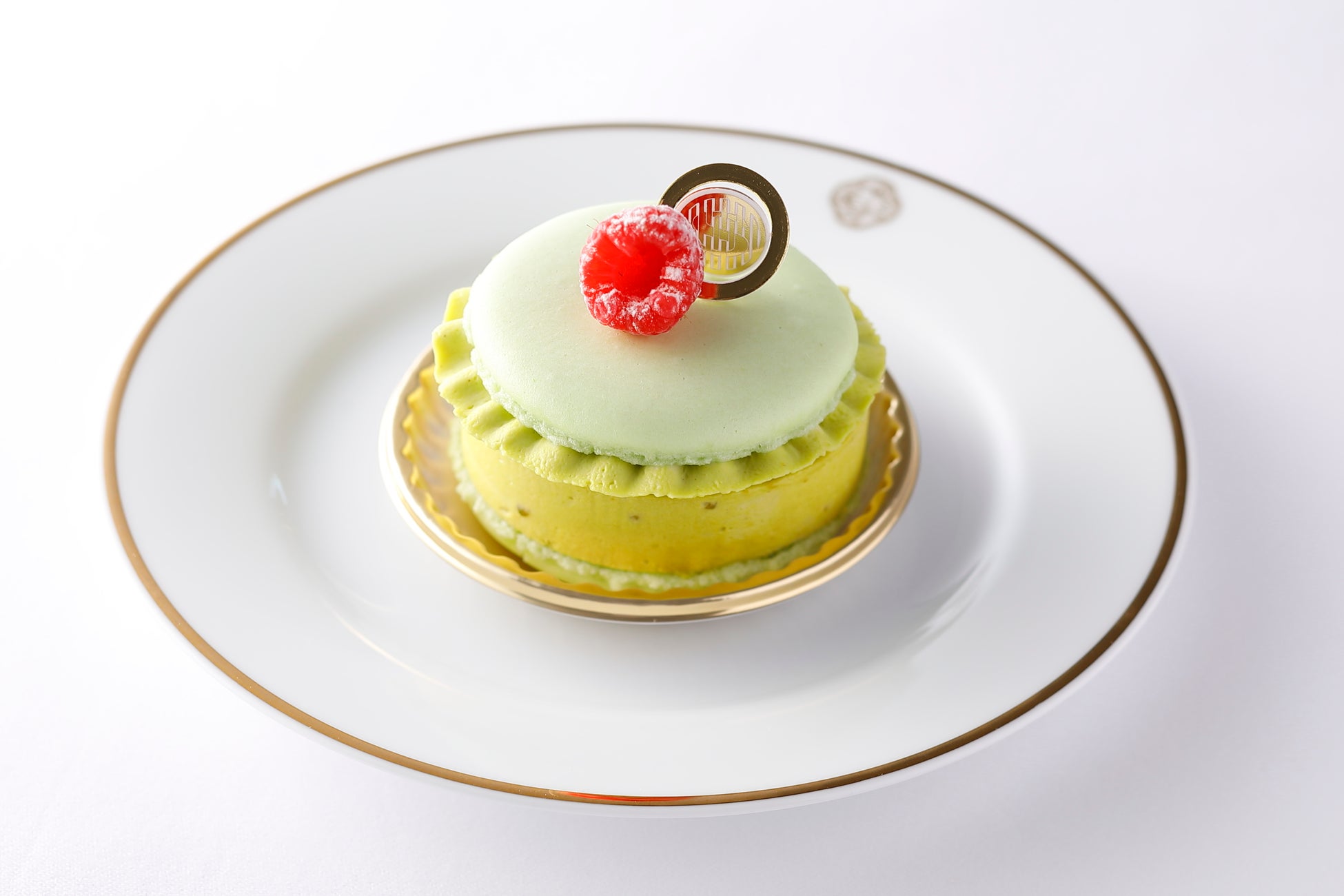 香り高いピスタチオ入りムースリーヌ(バター入りカスタードクリーム)にピスタチオシャンティを合わせ、ラズベリージュレをサンドした春らしいマカロンのケーキです。