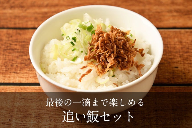 また、香ばしく甘みのあるフライドオニオン・白ネギがのった白飯の「追い飯セット」(+150円税込)を追加するのもおすすめです。旨味のスープを最後の一滴まで余すことなく、麺とは異なる味わいをお愉しみいただけます。