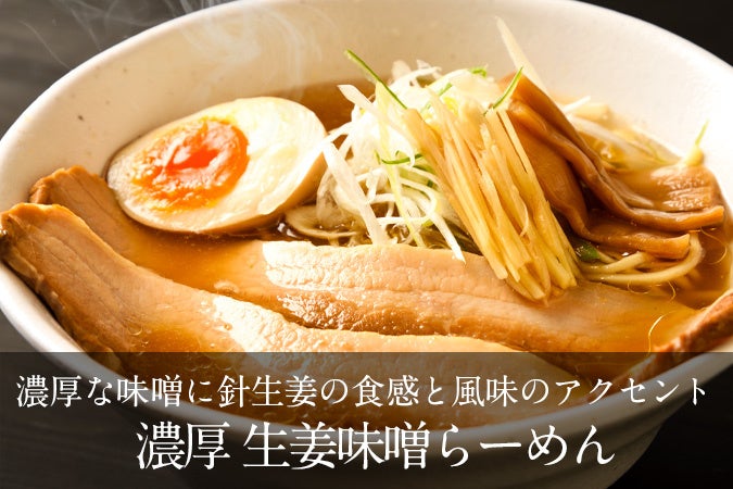 厳選した数種類の味噌をブレンドした、味噌の奥深い味わいと香味油が、スープに濃厚なコクを生み出します。針生姜の食感と風味は濃厚な味噌にアクセントを加え、寒い季節に身体を芯から温める一杯です。大判の豚バラチャーシューも2枚と満足のいく、ボリューム感です。