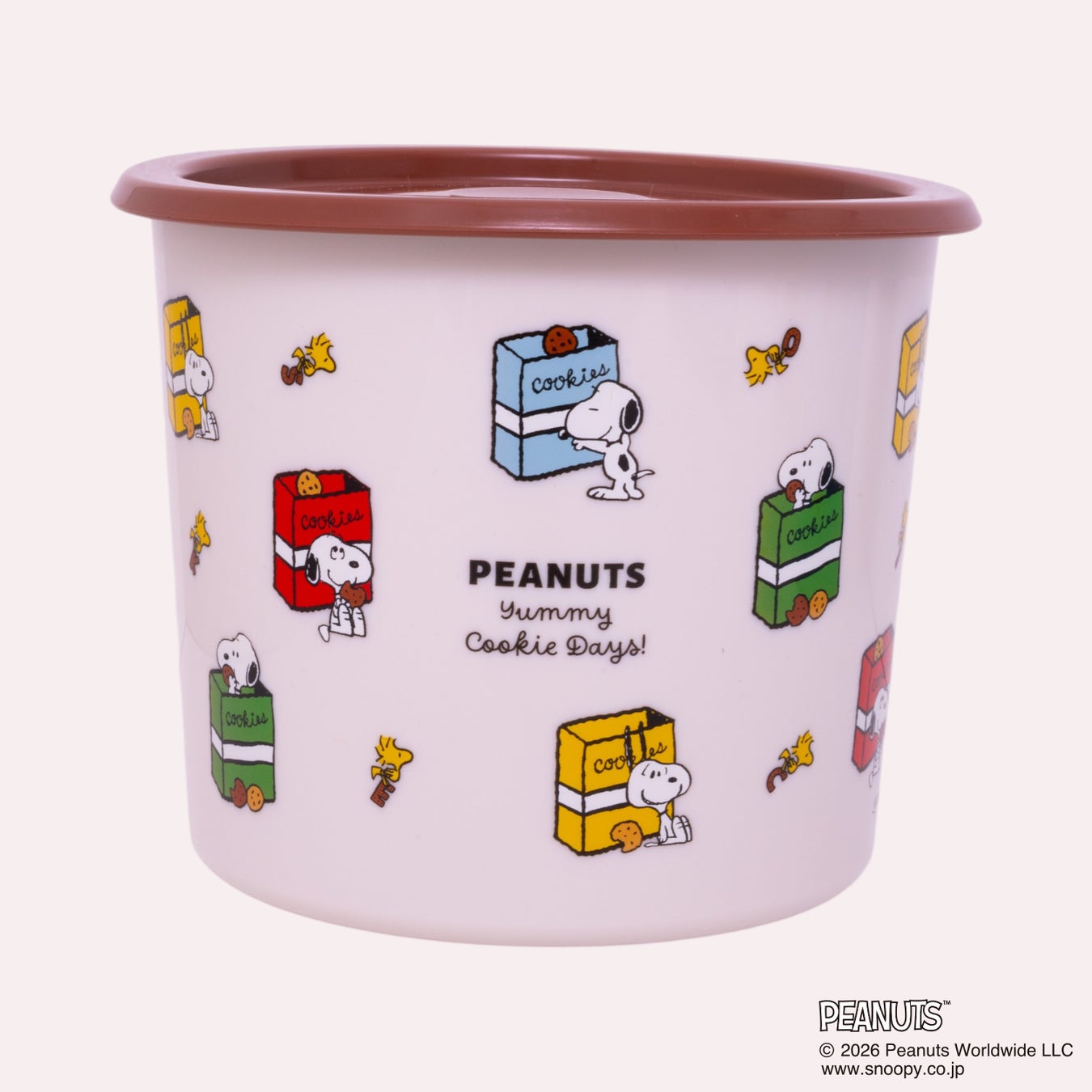 クッキーの箱を持ったり、美味しそうにクッキーを見つめる「スヌーピー」たちの姿が描かれています。