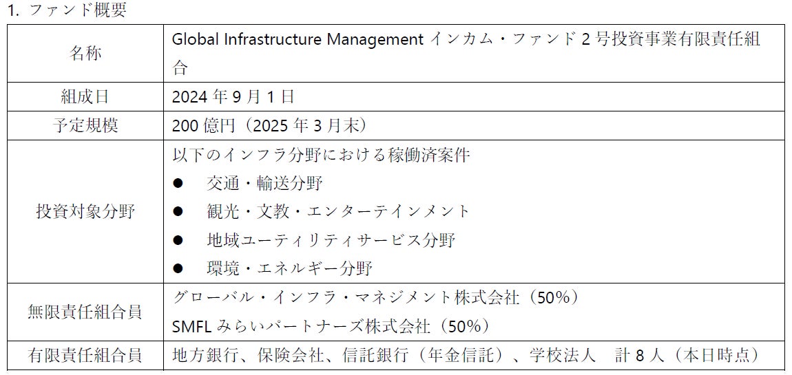 私どもは、2022年4月に組成した「Global Infrastructure Managementインカム・ファンド1号投資事業有限責任組合」の後続ファンドである本ファンドを通じ、社会を支えるインフラ事業へ投資・運用するファンドとしての責任を果たし、国内のインフラ資本市場の充実・拡大に貢献してまいります。