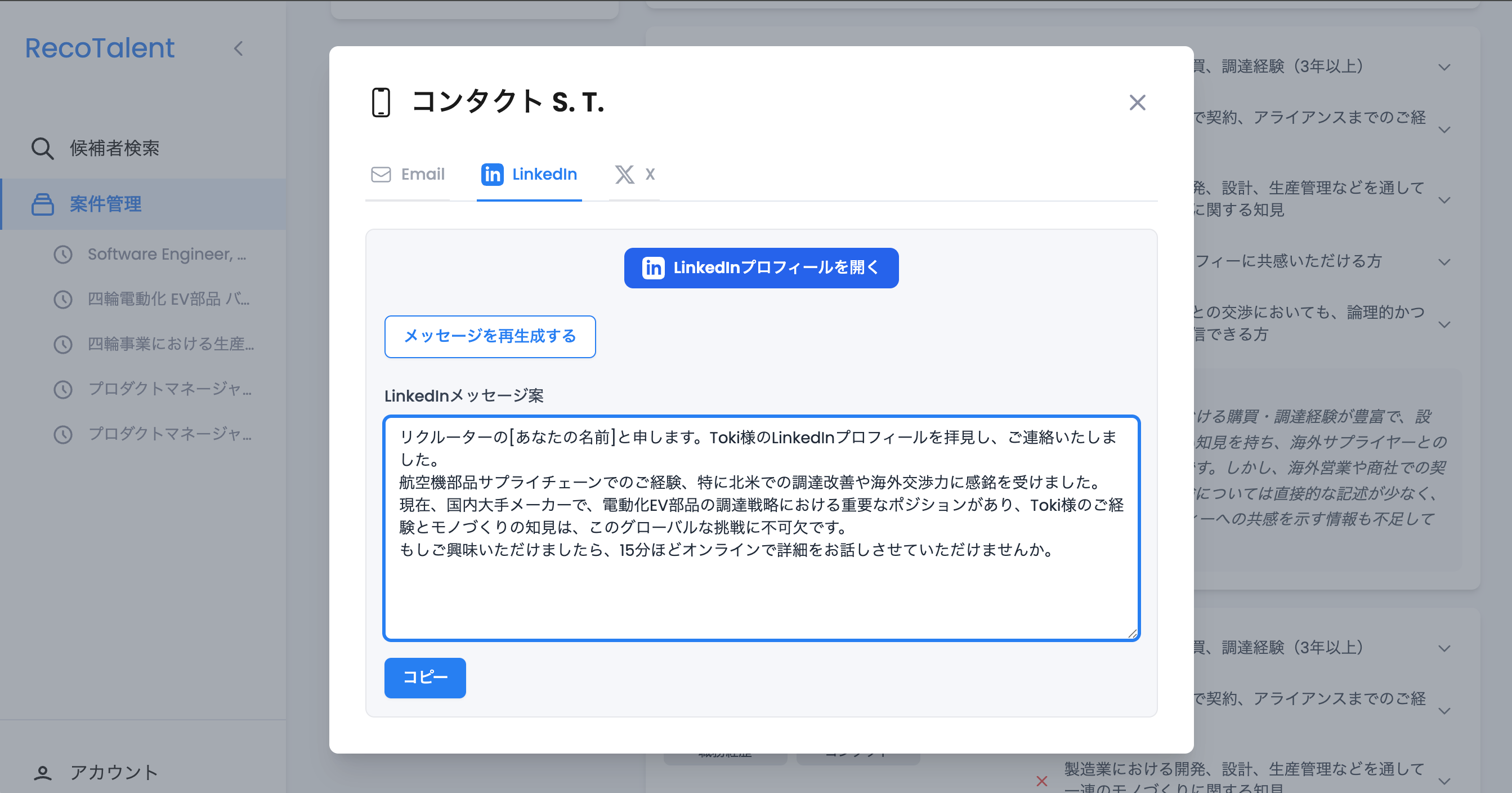 本機能は、こうした課題を解決するために開発されました。「RecoTalent for エンジニア」が発掘・スコアリングした候補者に対し、AIが求人票と候補者の職務経歴やスキル、キャリアプランなどに合わせた最適なスカウトメールのドラフトを自動で生成します。