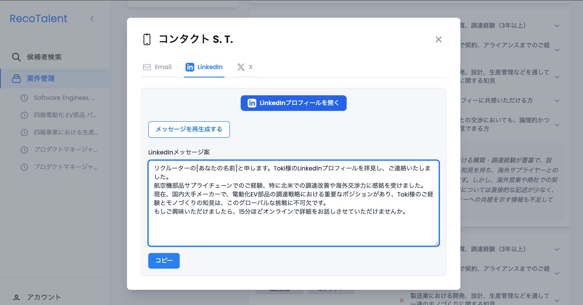 「RecoTalent for エンジニア」の「AIによる潜在候補者の自動発掘」機能と組み合わせることで、「貴社に最適な候補者を見つけ出し、その候補者に最も響くメッセージを自動で生成する」という、ダイレクトリクルーティングの重要なプロセスをワンストップで実現します。これにより、企業とエンジニアの出会いの質と量を飛躍的に向上させます。