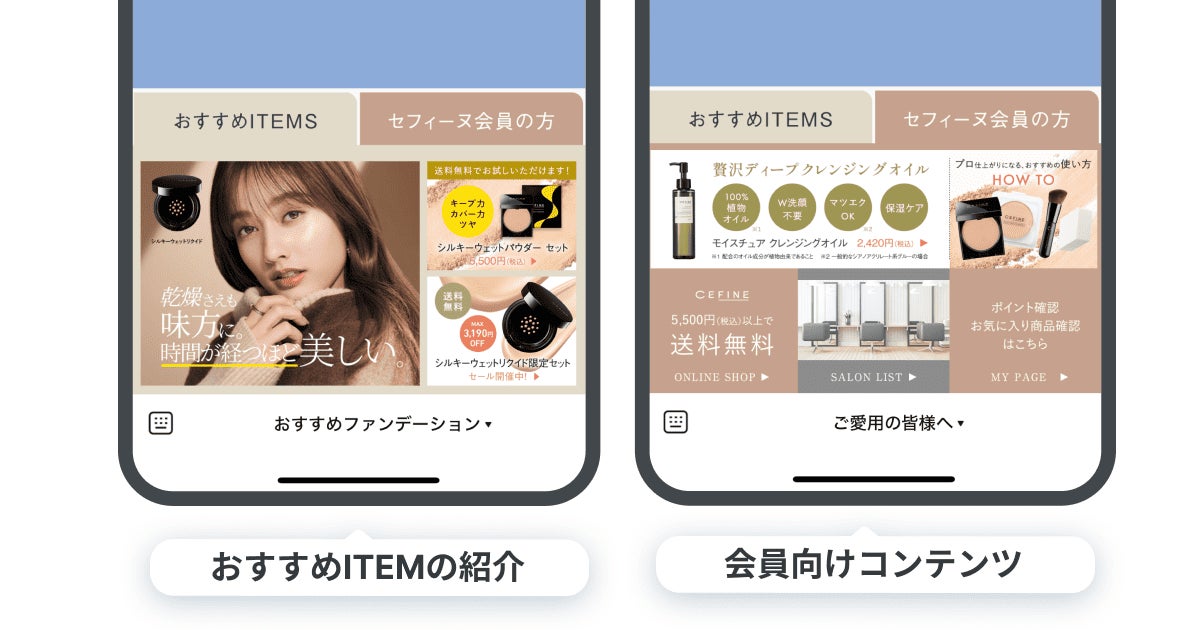 現在セフィーヌでは、2024年8月に公式アンバサダーとして谷まりあさんを起用した「シルキーウェットパウダー」「シルキーウェット リクイド」の販売に力を入れています。タブ型リッチメニュー活用により、LINE公式アカウントの「顔」ともいえるリッチメニューで、イチオシ商品の訴求と会員向けメニュー(使い方案内やマイページへのログイン導線など)を両立できるようになりました。