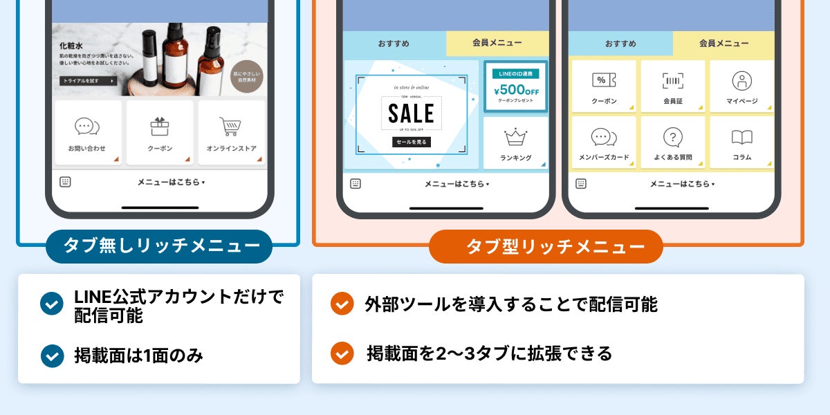ソーシャルPLUSなどのツールを用いてタブ型リッチメニューを導入することで、リッチメニューを2〜3タブで切り替えられるようになります。これにより、掲載できるメニューが増え、おすすめのキャンペーン情報と既存会員向けの便利コンテンツをタブで分けるなど、より分かりやすいリッチメニューを提供可能になります。