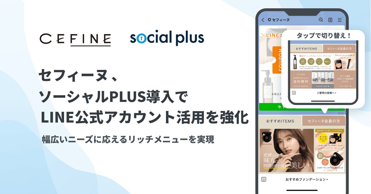 株式会社ソーシャルPLUS(所在地:東京都港区、代表取締役:岡田 風早)が開発・提供するLINE公式アカウントの拡張ツール「ソーシャルPLUS」が、株式会社セフィーヌ(本社:東京都港区、代表取締役社長:三好秀樹)が運営するLINE公式アカウント「セフィーヌ」で採用されました。