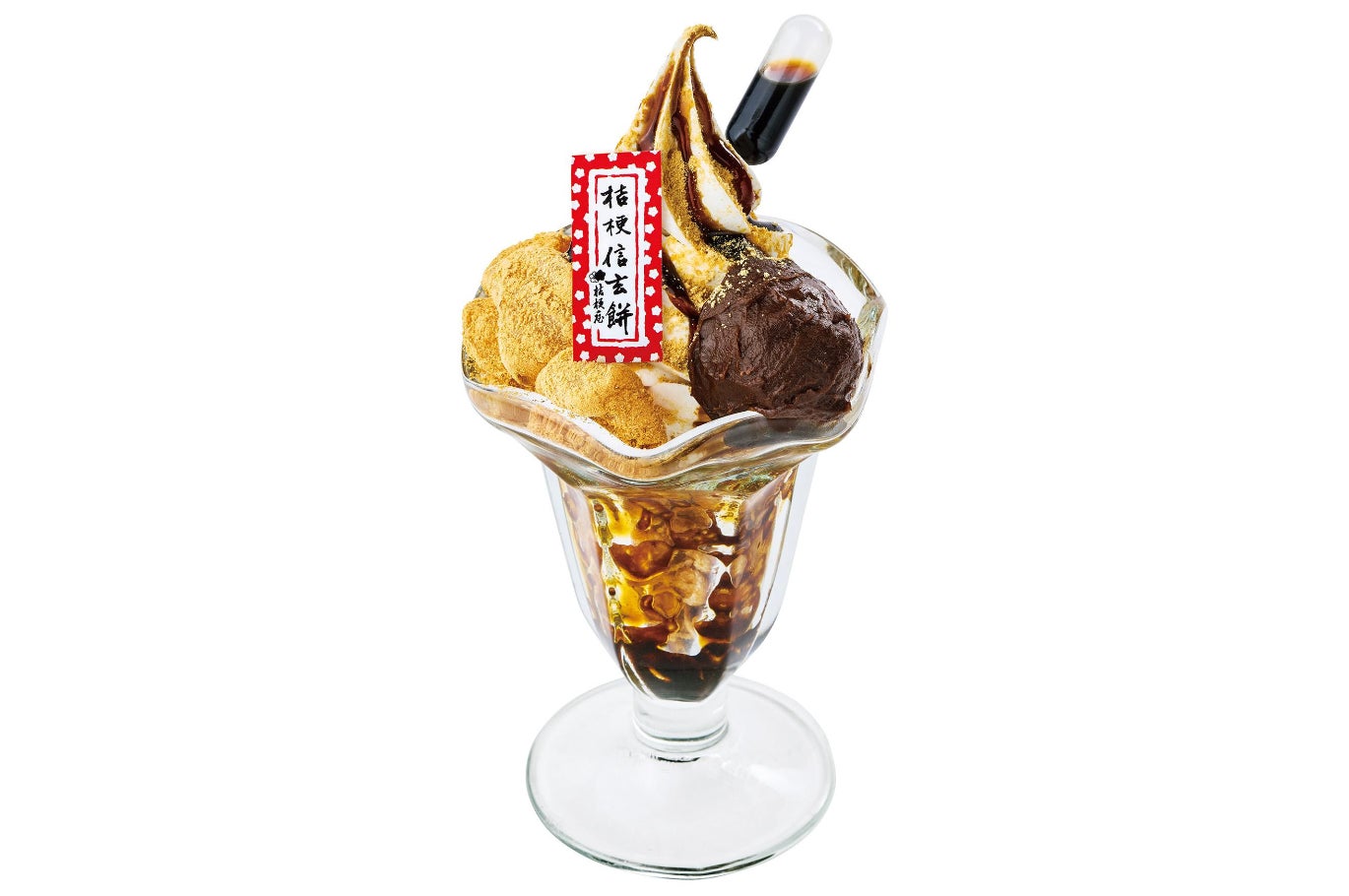 「桔梗信玄餅パフェ」は、「桔梗信玄餅」にも使用されているきな粉と黒みつに加え、昨年の2倍のわらび餅を使用しており、和の風味を存分に味わえる満足感たっぷりのパフェです。「桔梗信玄餅」と同じように、お好みで黒みつをかけながら楽しめる「追い黒みつスポイト」もポイントです。