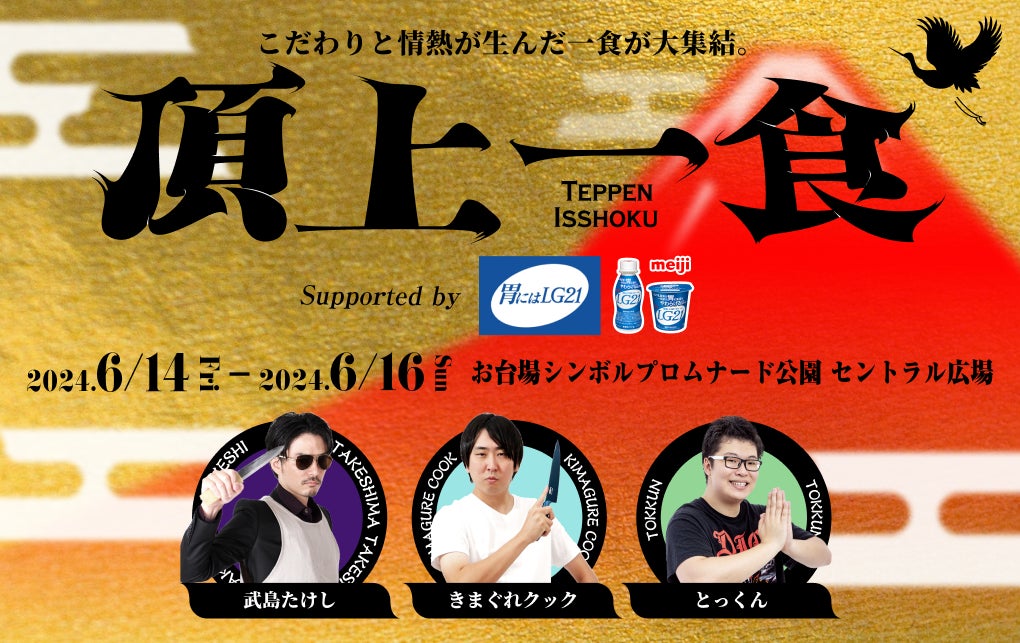新たな食フェス【頂上一食 ~TEPPEN ISSHOKU~ supported by『胃にはLG21』】は、2024年6月14日(金)~16日(日)の三日間にわたり、東京・お台場「シンボルプロムナード公園セントラル広場」にて開催となります。