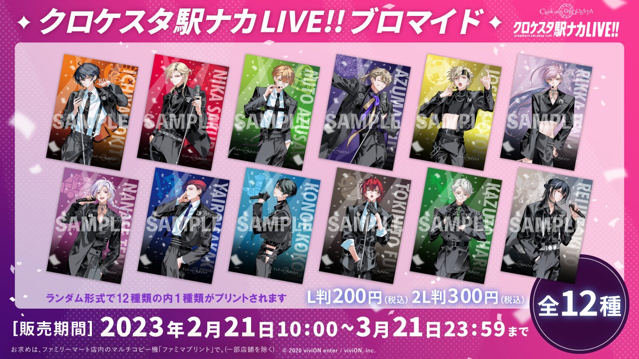 イベントの開催期間にあわせ、クロケスタ駅ナカLIVE!!のビジュアルを用いたキャラクターブロマイドを、ファミマプリントにて販売します。