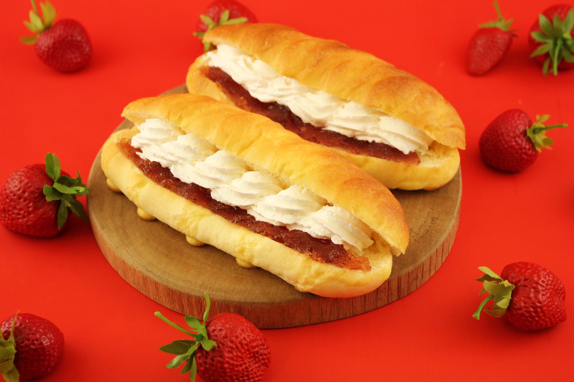 価格:持ち帰り 162円(税込)・店内飲食 165円(税込)クッキー生地をトッピングしたパンに、あまおういちごのジャムとホイップをサンドしました。