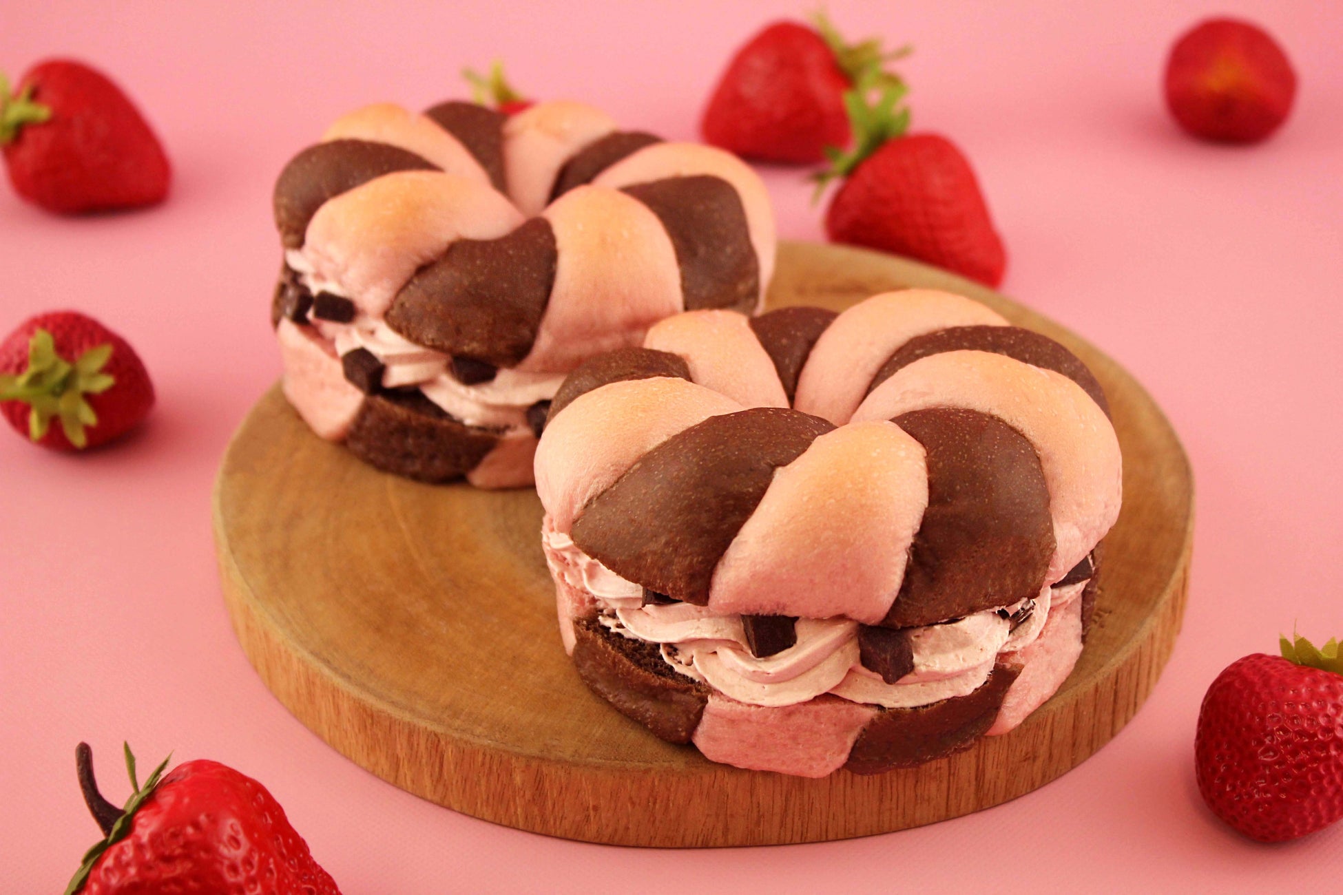価格:持ち帰り 173円(税込)・店内飲食 176円(税込)いちごとチョコの2種類の生地をねじって、いちごホイップとチャンクチョコをサンドしました。